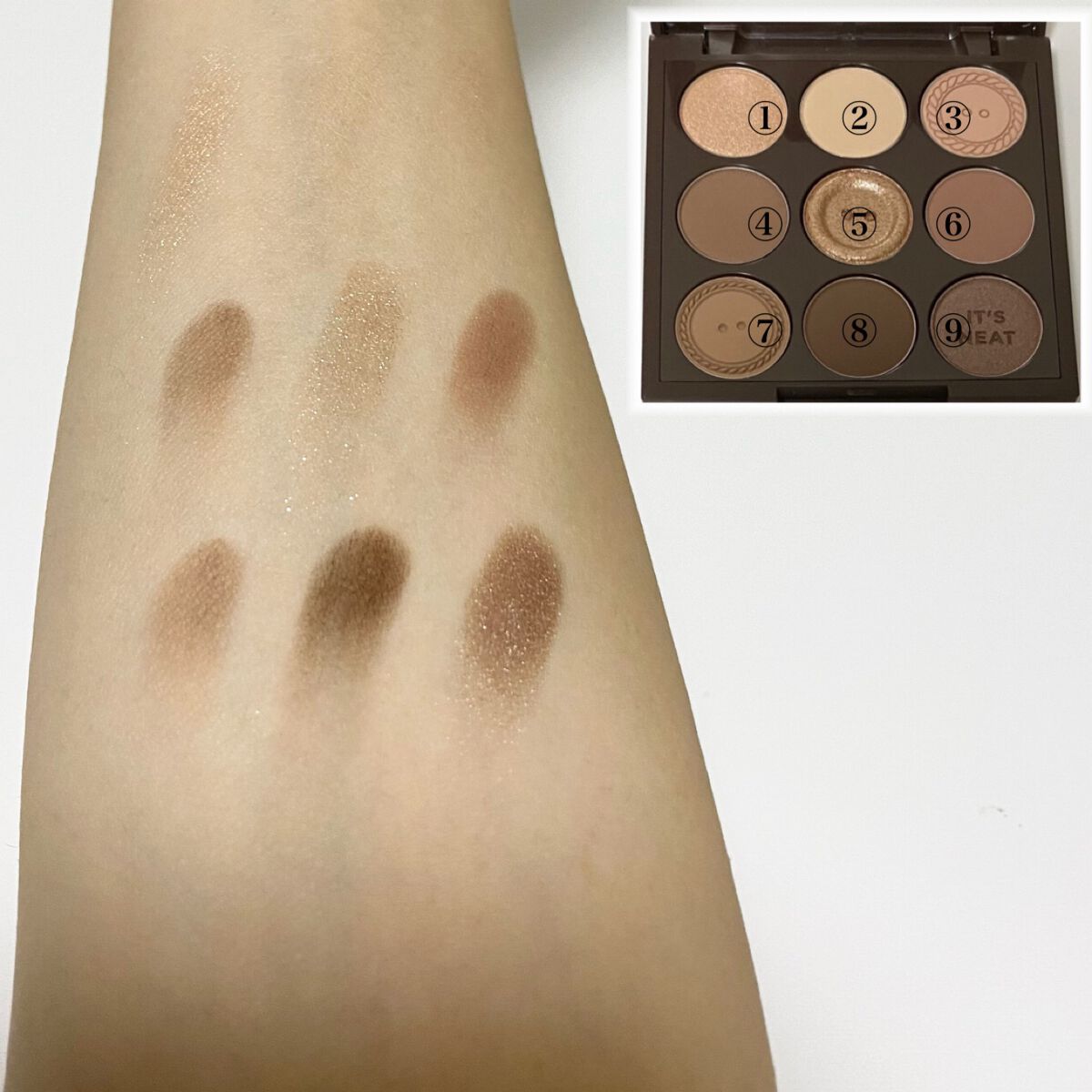 05 NEAT KNIT ナチュラルなデイリー使いしやすいカラーになっています! ニットのデザインになってるのが可愛すぎる♡ BUTTON UP 05に比べて濃いめのブラウンカラーで、こちらも使いやすい色味です。こっちはボタンのデザインになってます。可愛すぎる♡ ①はシマー ⑤は①よりも粒の大きなラメ 他はマットです ①⑤⑨はラメ系で他はマットです。 ③⑥は血色感もちゃんとある感じのブラウンなので、マスクしてても目が映えます 結構どのカラーも見たまま発色です