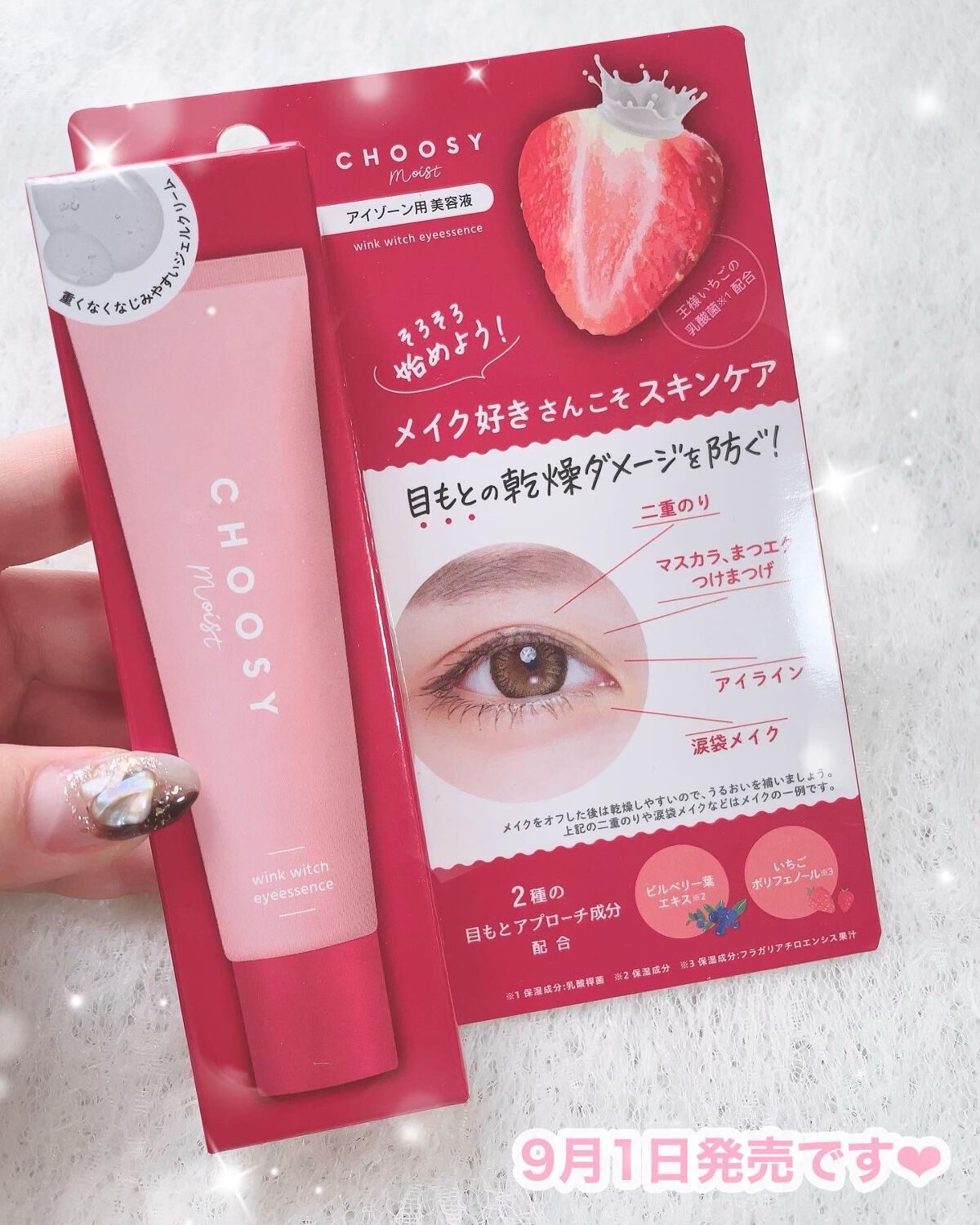 - ●アイメイクやクレンジングで摩擦ダメージの影響を受けやすい目元用美容液。 ●重くなくなじみやすいジェルクリームが肌の角質層にすーっと浸透して、メイク前にも使えます。 ●夜寝る前にたっぷり “ 塗るパック ” として使っても、ふっくら*潤いの続く目もとに。*角質層まで ●2 種の目もとアプローチ成分「ビルベリー葉エキス※ 1、いちごポリフェノール※ 2」配合。 ◆「王様いちごの乳酸菌※ 3」配合。 ◆グリセリンフリー処方。 ◆お手入れのテンションがあがる、みずみずしいストロベリーの香り。 ◆弱酸性、パラベンフリー、エタノールフリー。 ※1保湿成分 ※2保湿成分:フラガリアチロエンシス果汁 ※3乳酸桿菌