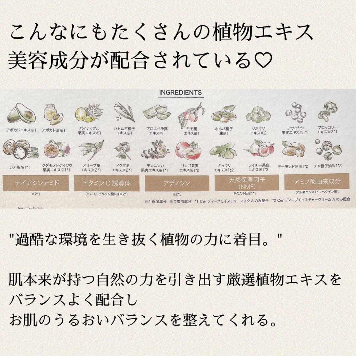 - Cer ディープモイスチャーマスク A 水、BG、グリセリン、1,2-ヘキサンジオール、ヒアルロン酸Na、アボカドエキス、アボカド油、パイナップル果実エキス、クダモノトケイソウ果実エキス、アサイヤシ果実エキス、テンニンカ果実エキス、モモ葉エキス、アロエベラ葉エキス、オリーブ葉エキス、ブロッコリーエキス、ハトムギ種子エキス、ツボクサエキス、ドクダミエキス、ホホバ種子油、ナイアシンアミド、アスコルビルリン酸Na、酢酸トコフェロール、ピリドキシンHCl、パントテン酸Ca、グリコシルトレハロース、ベタイン、シア脂、PCA-Na、ビスPEG-18メチルエーテルジメチルシラン、オクテニルコハク酸デンプンNa、マルトデキストリン、シリカ、オリーブ油脂肪酸セテアリル、オリーブ油脂肪酸ソルビタン、セスキオレイン酸ソルビタン、加水分解水添デンプン、ジメチコン、キサンタンガム、カルボマー、アルギニン、PEG-60水添ヒマシ油、フェノキシエタノール、EDTA-2Na、クスノキ樹皮油、オレンジ果皮油、イランイラン花油、ライム油、ジャスミン油、エンピツビャクシン油 Cer ディープモイスチャークリーム A 水、アロエベラ葉エキス、トリ(カプリル酸/カプリン酸)グリセリル、ペンチレングリコール、BG、スクワレン、ポリソルベート80、ヒアルロン酸Na、アボカドエキス、アボカド油、パイナップル果実エキス、ライチー果皮エキス、モモ葉エキス、ハトムギ種子エキス、ツボクサエキス、リンゴ果実エキス、キュウリエキス、ホホバ種子油、アーモンド油、チャ種子油、1,2-ヘキサンジオール、ベタイン、アラントイン、アデノシン、パンテノール、酢酸トコフェロール、パルミトイルペンタペプチド-4、(C13,14)イソパラフィン、トリステアリン酸ソルビタン、ポリアクリル酸Na、カプリル酸グリセリル、ジメチコン、ラウレス-7、セテアリルアルコール、EDTA-2Na、クスノキ樹皮油、オレンジ果皮油、イランイラン花油、ライム油、ジャスミン油、エンピツビャクシン油