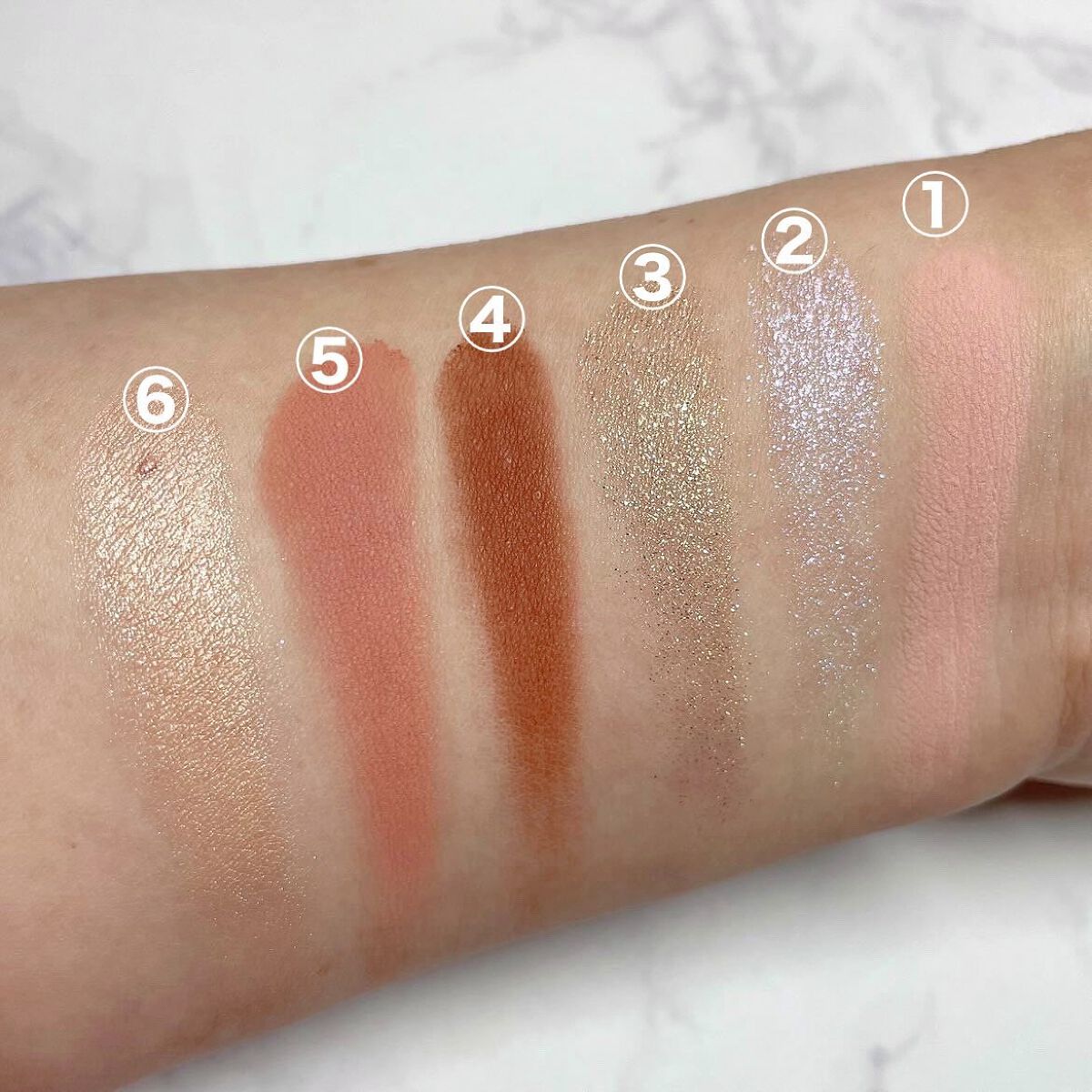 テクスチャーはサラサラだけど、飛び散るわけではなくて吸い付いてくる感じでした。 グリッターは、湿式のウェットさと押すとムニっとして、ちょっとゼリーテイストな気がします。ギラギラすぎなくて使いやすかったです。 ⑥はピンクも混ざっていてとても可愛い。アイスクリーム屋さんのストロベリーチーズケーキみたいな🍓これも、白すぎなくて肌馴染みの良い白系なので使いやすかったです。