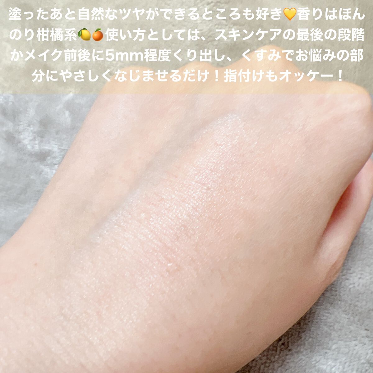 - 肌への刺激が少ない使い心地で気になるところにアプローチ! どこでも手軽に! 使用方法 スキンケアの最後の段階またはメイク前後に、5mm程度中身を出し、くすみ*でお悩みの部分にやさしくなじませます。 *乾燥による