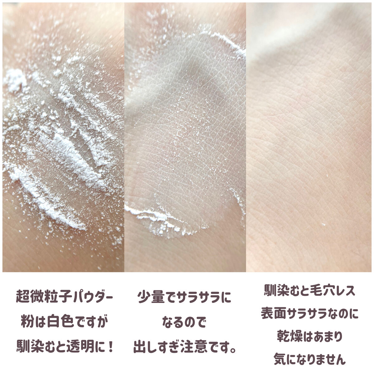 パウダーの粒子が細かい! 細すぎてパウダーが舞ってしまう! 入れ物が可愛い ・パウダーの粒子細かく、着け心地が軽い 使用時白く残ってしまう ・すぐにテカってしまった