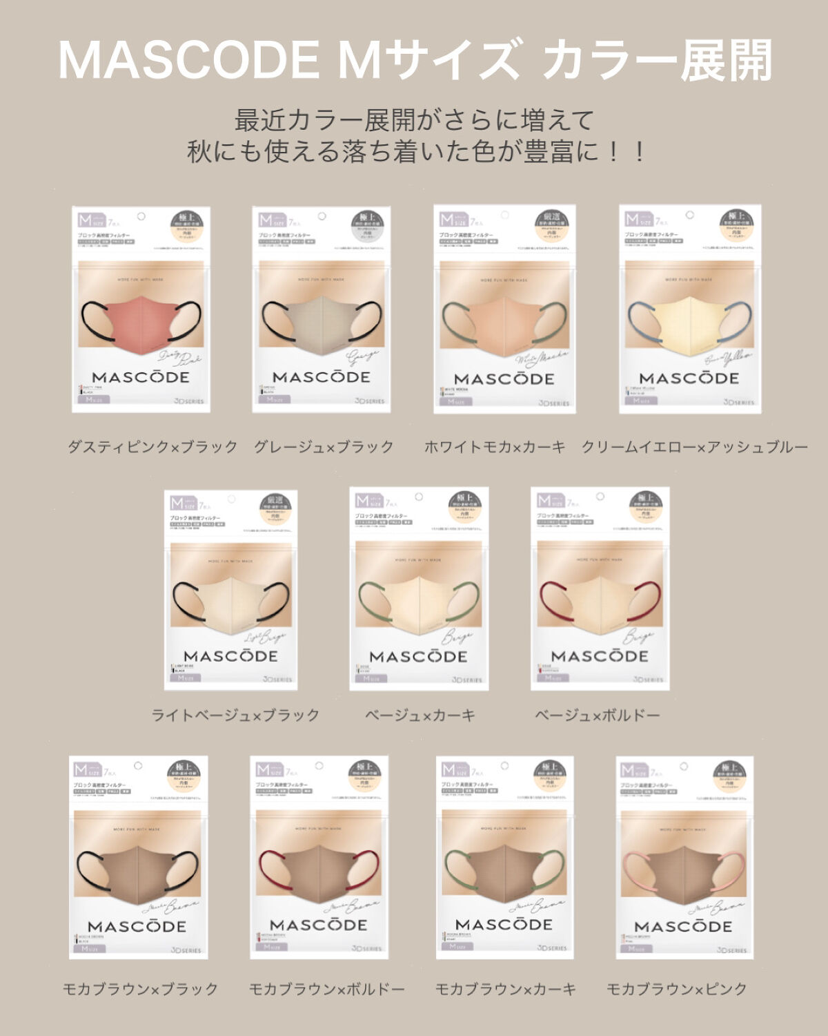 ① MASCODEMサイズ/モカブラウン ② be-styleふつうサイズ/プレミアムホワイト ③ 3D Beauty Maskワンサイズ/ココアベージュ ④ SPUN MASKワンサイズ/ベージュ ⑤ SMART COLORワンサイズ/ベージュ ⑥ DAILY FIT MASKSサイズ/ブラウン