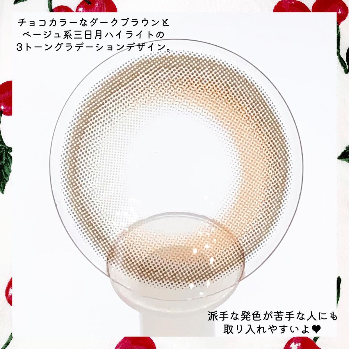 チェリー柄のパッケージが可愛いブラウンカラコン🍒 チョコ、ブラウン、ゴールドの3色のブラウンカラーのグラデーション🤎 着色直径も13.2mmだから、裸眼よりひとまわり大きく、だけど自然なサイズ感でナチュラルな仕上がり! 三日月型にハイライトが入っているから、瞳にさりげなく立体感を見せてくれるよ✨
