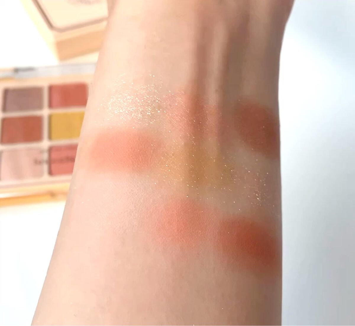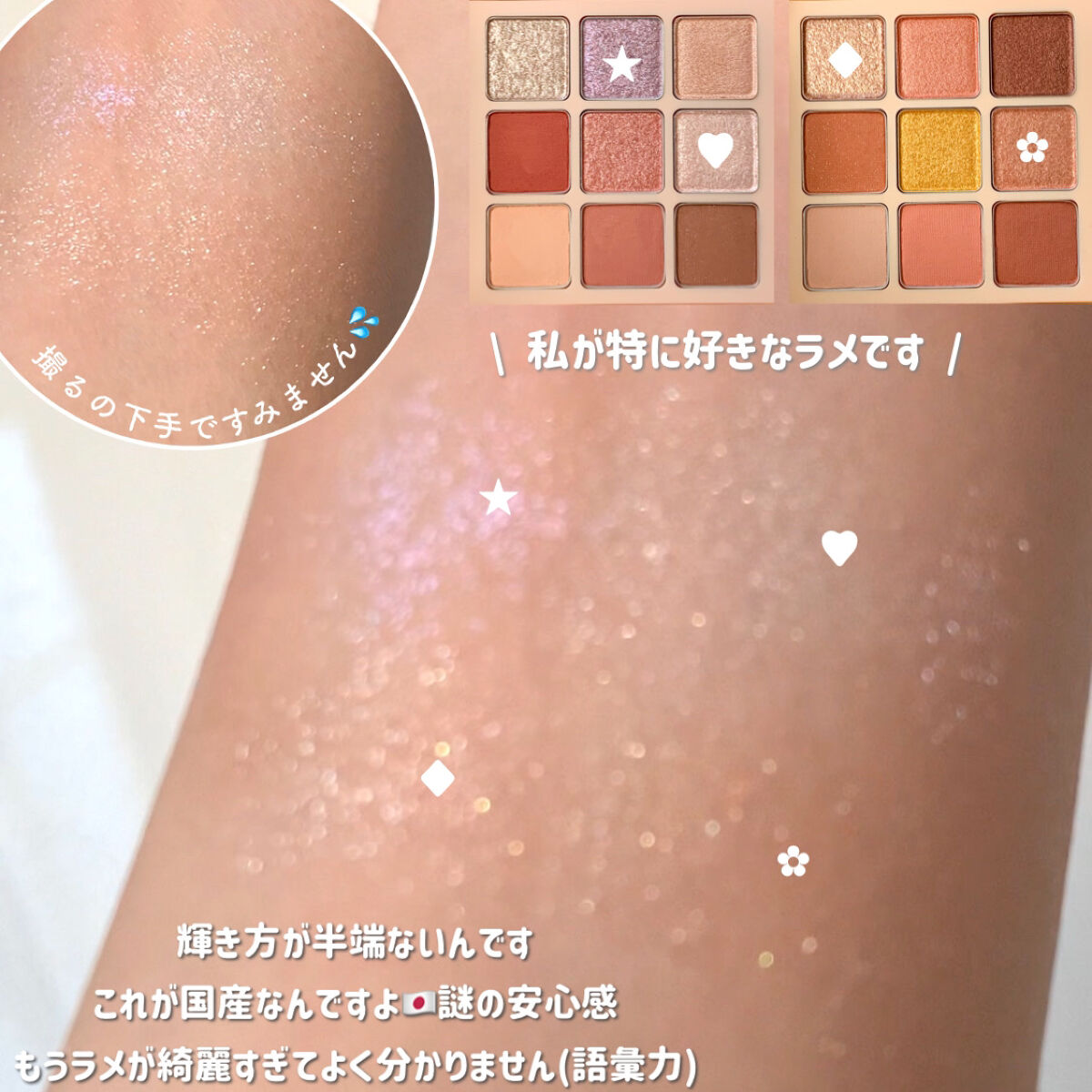 - 01 <a/f> ジメチコン、トリ(カプリル酸/カプリン酸)グリセリル、(ジメチコン/ビニルジメチコン) クロスポリマー、タルク、カルナウバロウ、クロルフェネシン、デヒドロ酢酸Na、ラウロイルリシン、トコフェロール、ホウケイ酸(Ca/Al)、マイカ、(PET/ポリメタクリル酸メチル)ラミネート、酸化チタン、酸化鉄、赤226、グンジョウ、酸化スズ <b/e> トリ(カプリル酸/カプリン酸)グリセリル、シリカ、ダイマージリノール酸ジ(イソステアリル/フィトステリル)、合成フルオロフロゴパイト、ダイマージリノール酸ダイマージリノレイルビス(ベヘニル/イソステアリル/フィトステリル)、水酸化Al、カルナウバロウ、トコフェロール、ホウケイ酸(Ca/Al)、マイカ、酸化チタン、酸化鉄、グンジョウ、赤226、コンジョウ、酸化スズ <c> アルミナ、合成フルオロフロゴパイト、タルク、ジフェニルシロキシフェニルトリメチコン、水添ポリデセン、(イソステアリン酸ポリグリセリル-2/ダイマージリノール酸)コポリマー、ジメチコン、硫酸Ba、ジステアリン酸Al、クロルフェネシン、デヒドロ酢酸Na、ステアリン酸Mg、トコフェロール、酸化チタン、マイカ、酸化鉄、グンジョウ、酸化スズ <d/g/h/i> タルク、合成フルオロフロゴパイト、窒化ホウ素、スクワラン、ナイロン-12、(ビニルジメチコン/メチコンシルセスキオキサン)クロスポリマー、ペンチレングリコール、ホホバ種子油、デヒドロ酢酸Na、水酸化Al、シア脂、トコフェロール、マイカ、酸化鉄、酸化チタン、赤226、グンジョウ、ホウケイ酸(Ca/Al)、酸化スズ 02 <a> ジメチコン、トリ(カプリル酸/カプリン酸)グリセリル、(ジメチコン/ビニルジメチコン)クロスポリマー、タルク、カルナウバロウ、クロルフェネシン、デヒドロ酢酸Na、ラウロイルリシン、トコフェロール、マイカ、ホウケイ酸(Ca/Al)、酸化チタン、酸化鉄、酸化スズ <b> アルミナ、タルク、合成フルオロフロゴパイト、ジフェニルシロキシフェニルトリメチコン、水添ポリデセン、(イソステアリン酸ポリグリセリル-2/ダイマージリノール酸)コポリマー、ジメチコン、硫酸Ba、ジステアリン酸Al、ステアリン酸Mg、クロルフェネシン、デヒドロ酢酸Na、トコフェロール、酸化チタン、マイカ、酸化鉄、赤226、グンジョウ、酸化スズ <c/e/f> トリ(カプリル酸/カプリン酸)グリセリル、シリカ、ダイマージリノール酸ジ(イソステアリル/フィトステリル)、ダイマージリノール酸ダイマージリノレイルビス(ベヘニル/イソステアリル/フィトステリル)、水酸化Al、合成フルオロフロゴパイト、カルナウバロウ、トコフェロール、マイカ、ホウケイ酸(Ca/Al)、酸化チタン、酸化鉄、黄4、赤226、グンジョウ、酸化スズ <d/g/h/i> タルク、合成フルオロフロゴパイト、窒化ホウ素、スクワラン、ナイロン-12、(ビニルジメチコン/メチコンシルセスキオキサン)クロスポリマー、ペンチレングリコール、ホホバ種子油、デヒドロ酢酸Na、水酸化Al、シア脂、トコフェロール、マイカ、酸化鉄、酸化チタン、ホウケイ酸(Ca/Al)、赤226、黄4、グンジョウ、酸化スズ ※アルファベットはパレットを正面から見た1段目左からabc、2段目左からdef、3段目左からghiの順です。