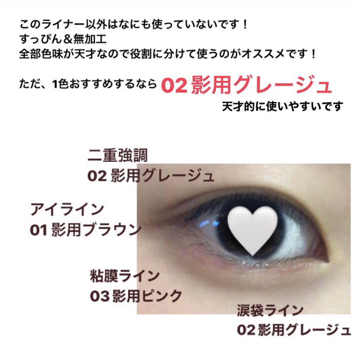 - ふたえを強調させる薄いブラウンのアイライナー。 ふたえが自然とくっきり見え、大きな目元に。下まぶたにラインを描くと涙袋がぷっくりし、より立体感のある仕上がりに。 リキッドアイブロウとしてもお使いいただけます。 皮脂・こすれに強いタイプ。簡単にお湯でオフ。