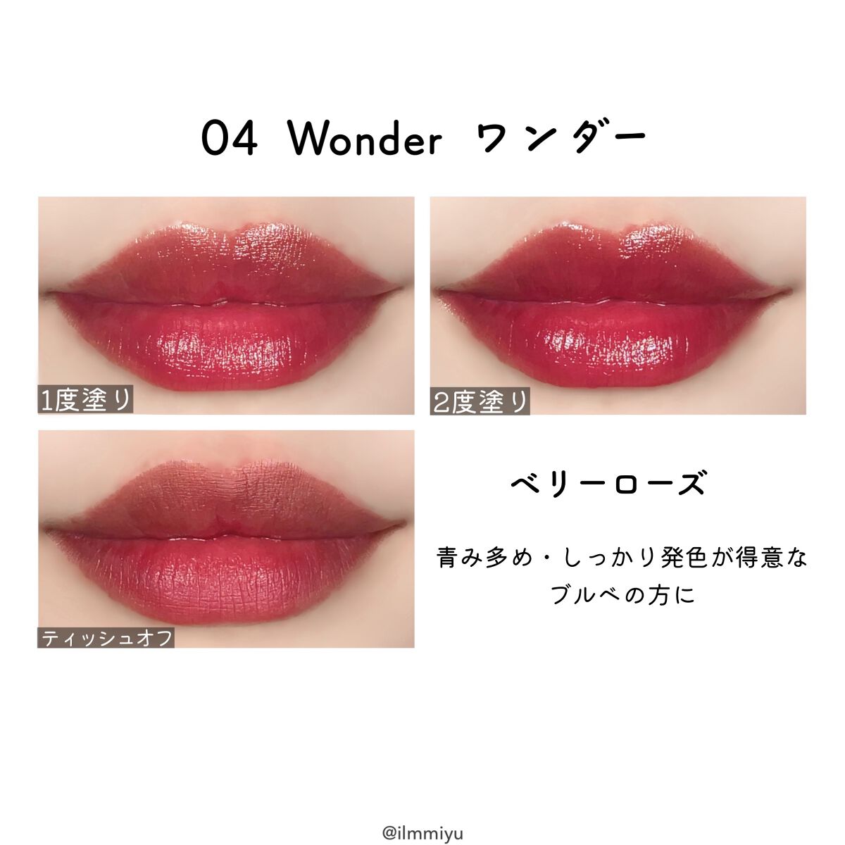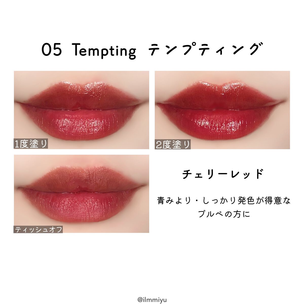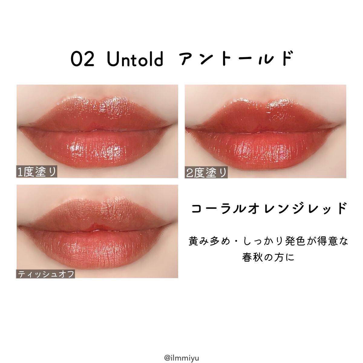 - <01 Vague> 水、リンゴ酸ジイソステアリル、ジフェニルジメチコン、水添ポリイソブテン、トリメリト酸トリトリデシル、トリイソステアリン酸ポリグリセリル-2、ビスジグリセリルポリアシルアジペート-2、グリセリン、ダイマージリノール酸ジ(イソステアリル/フィトステリル)、セチルPEG/PPG-10/1ジメチコン、ダイマージリノール酸(フィトステリル/イソステアリル/セチル/ステアリル/ベヘニル)、ポリソルベート60、1,2-ヘキサンジオール、ダイマージリノール酸ダイマージリノレイルビス(ベヘニル/イソステアリル/フィトステリル)、ステアリン酸PEG-100、ステアリン酸グリセリル、酸化チタン、ポリアクリレート-13、セスキオレイン酸ソルビタン、(アクリル酸ヒドロキシエチル/アクリロイルジメチルタウリンNa)コポリマー、フェノキシエタノール、ポリイソブテン、クエン酸Na、香料、ステビオシド、エチルヘキシルグリセリン、黄4、イソステアリン酸ソルビタン、赤227、ポリソルベート20、水酸化Al、ポリアクリル酸アンモニウム、クエン酸、BG、青1、DPG、トコフェロール、ミズハッカエキス、トリフルオロ酢酸テトラデシルアミノブチロイルバリルアミノ酪酸ウレア、塩化Mg <02 Untold> 水、リンゴ酸ジイソステアリル、ジフェニルジメチコン、水添ポリイソブテン、トリメリト酸トリトリデシル、トリイソステアリン酸ポリグリセリル-2、ビスジグリセリルポリアシルアジペート-2、グリセリン、ダイマージリノール酸ジ(イソステアリル/フィトステリル)、セチルPEG/PPG-10/1ジメチコン、ダイマージリノール酸(フィトステリル/イソステアリル/セチル/ステアリル/ベヘニル)、ポリソルベート60、1,2-ヘキサンジオール、ダイマージリノール酸ダイマージリノレイルビス(ベヘニル/イソステアリル/フィトステリル)、ステアリン酸PEG-100、ステアリン酸グリセリル、ポリアクリレート-13、セスキオレイン酸ソルビタン、(アクリル酸ヒドロキシエチル/アクリロイルジメチルタウリンNa)コポリマー、フェノキシエタノール、ポリイソブテン、酸化チタン、クエン酸Na、香料、黄4、ステビオシド、エチルヘキシルグリセリン、イソステアリン酸ソルビタン、黄5、赤227、ポリソルベート20、水酸化Al、ポリアクリル酸アンモニウム、クエン酸、BG、青1、DPG、トコフェロール、ミズハッカエキス、トリフルオロ酢酸テトラデシルアミノブチロイルバリルアミノ酪酸ウレア、塩化Mg <03 Holy moly> 水、リンゴ酸ジイソステアリル、ジフェニルジメチコン、水添ポリイソブテン、トリメリト酸トリトリデシル、トリイソステアリン酸ポリグリセリル-2、ビスジグリセリルポリアシルアジペート-2、グリセリン、ダイマージリノール酸ジ(イソステアリル/フィトステリル)、セチルPEG/PPG-10/1ジメチコン、ダイマージリノール酸(フィトステリル/イソステアリル/セチル/ステアリル/ベヘニル)、ポリソルベート60、1,2-ヘキサンジオール、ダイマージリノール酸ダイマージリノレイルビス(ベヘニル/イソステアリル/フィトステリル)、ステアリン酸PEG-100、ステアリン酸グリセリル、ポリアクリレート-13、セスキオレイン酸ソルビタン、(アクリル酸ヒドロキシエチル/アクリロイルジメチルタウリンNa)コポリマー、酸化チタン、フェノキシエタノール、ポリイソブテン、黄4、クエン酸Na、香料、黄5、ステビオシド、エチルヘキシルグリセリン、イソステアリン酸ソルビタン、赤104(1)、ポリソルベート20、赤227、水酸化Al、ポリアクリル酸アンモニウム、クエン酸、BG、青1、DPG、トコフェロール、ミズハッカエキス、トリフルオロ酢酸テトラデシルアミノブチロイルバリルアミノ酪酸ウレア、塩化Mg <04 Wonder> 水、リンゴ酸ジイソステアリル、ジフェニルジメチコン、水添ポリイソブテン、トリメリト酸トリトリデシル、トリイソステアリン酸ポリグリセリル-2、ビスジグリセリルポリアシルアジペート-2、グリセリン、ダイマージリノール酸ジ(イソステアリル/フィトステリル)、セチルPEG/PPG-10/1ジメチコン、ダイマージリノール酸(フィトステリル/イソステアリル/セチル/ステアリル/ベヘニル)、ポリソルベート60、1,2-ヘキサンジオール、ダイマージリノール酸ダイマージリノレイルビス(ベヘニル/イソステアリル/フィトステリル)、ステアリン酸グリセリル、ステアリン酸PEG-100、ポリアクリレート-13、セスキオレイン酸ソルビタン、(アクリル酸ヒドロキシエチル/アクリロイルジメチルタウリンNa)コポリマー、酸化チタン、フェノキシエタノール、ポリイソブテン、黄5、クエン酸Na、赤227、香料、ステビオシド、エチルヘキシルグリセリン、イソステアリン酸ソルビタン、ポリソルベート20、赤104(1)、水酸化Al、ポリアクリル酸アンモニウム、クエン酸、BG、青1、DPG、トコフェロール、ミズハッカエキス、トリフルオロ酢酸テトラデシルアミノブチロイルバリルアミノ酪酸ウレア、塩化Mg <05 Tempting> 水、リンゴ酸ジイソステアリル、ジフェニルジメチコン、水添ポリイソブテン、トリメリト酸トリト
