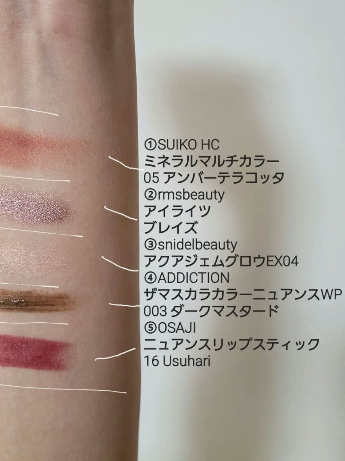 アイブロウは#whomeeのレッドブラウンを使用。 アイメイクは①#アンドビーの#クリームアイシャドウ マスタードを上下の瞼に。 アイメイクは②#misshaの#グリッタープリズムシャドウマーブル #ストームプリズムを①に重ねて。 下瞼は全体ではなく、黒目下にだけ✨ アイメイクは③#hinceの#ニューアンビエンスカラーアイライナー #エクレクティックを4枚目のように三角形に入れる。 チークは⑤#bisouの#ダイヤモンドグロウ マーズをほんのり✨ リップは⑥①のマスタードを塗った後に#celvokeの#エンスロールマットリップス 03を💋