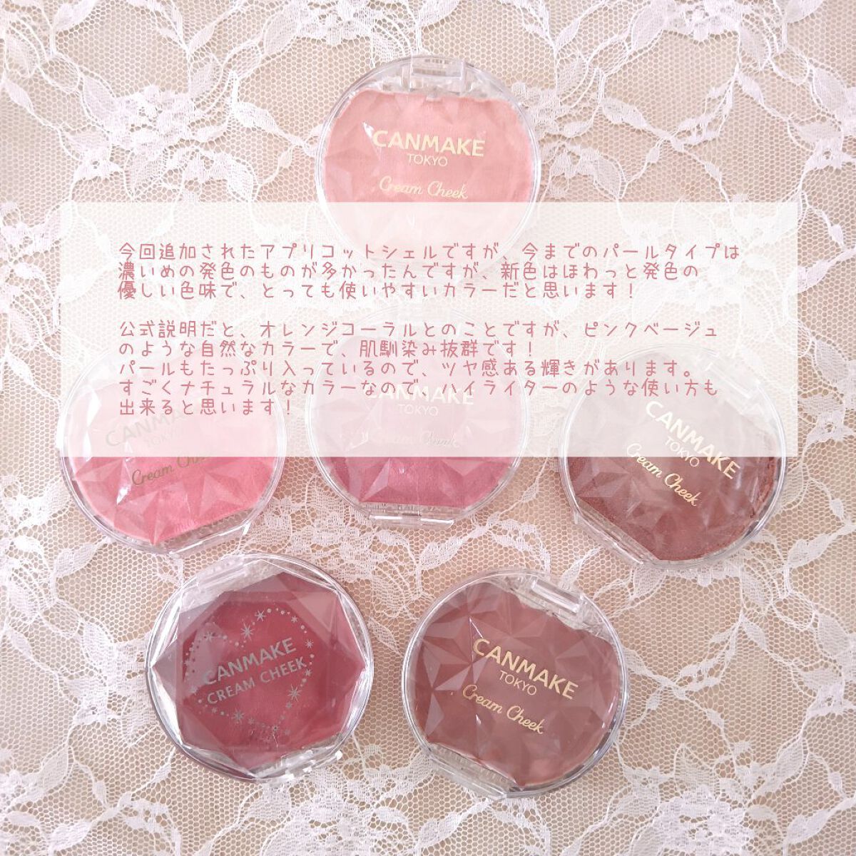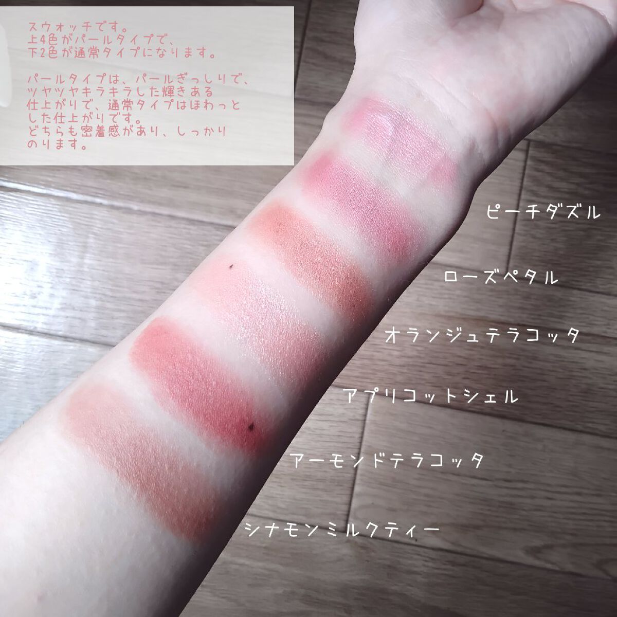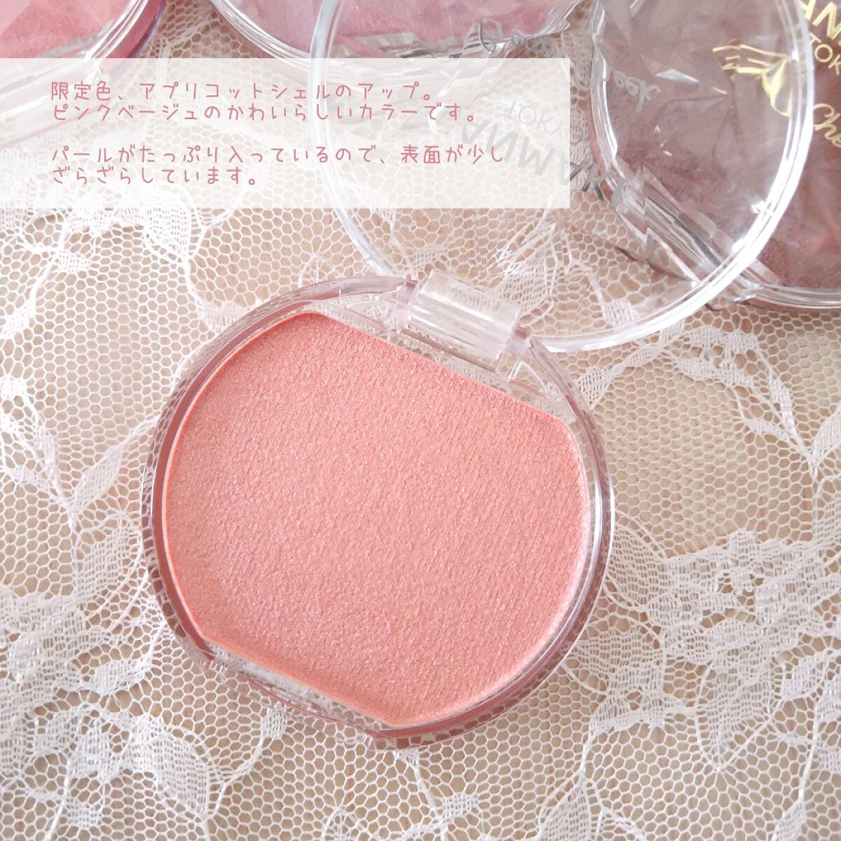 通常タイプは、しっとりした感じでつきます。 パールタイプはパールがキラキラ反射し、肌にツヤ感がでます。 今回追加されたアプリコットシェルですが、新色はほわっと発色の優しい色味で、とっても使いやすいカラーだと思います!