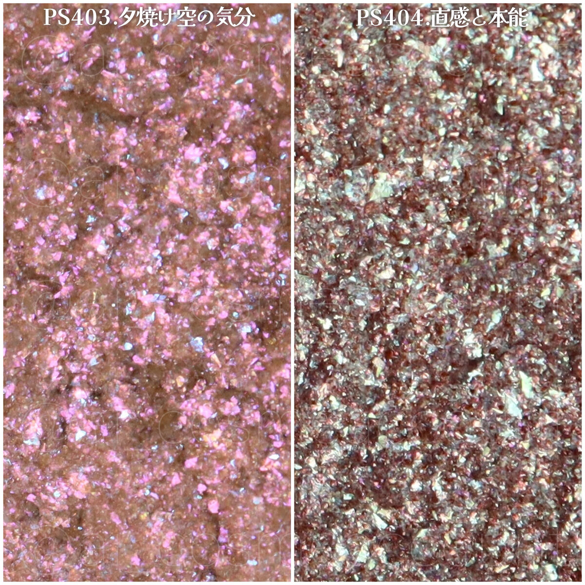 S[SHINY]“高輝度ガラスパール×カラーパールの美しいきらめき”↓S01.ピュアブロンズ“上品に艶めくブロンズゴールド” R[RICH]“リッチな高発色と繊細なツヤで色遊びを楽しめる”↓R01.バニラムスク“光を集めるハイライトベージュ” F[FLUFFY]“ふんわり・しっとりの新感覚 肌と同化するセミマット”↓F01.ラストナイト“血色感を潜ませるメロウなピンク”