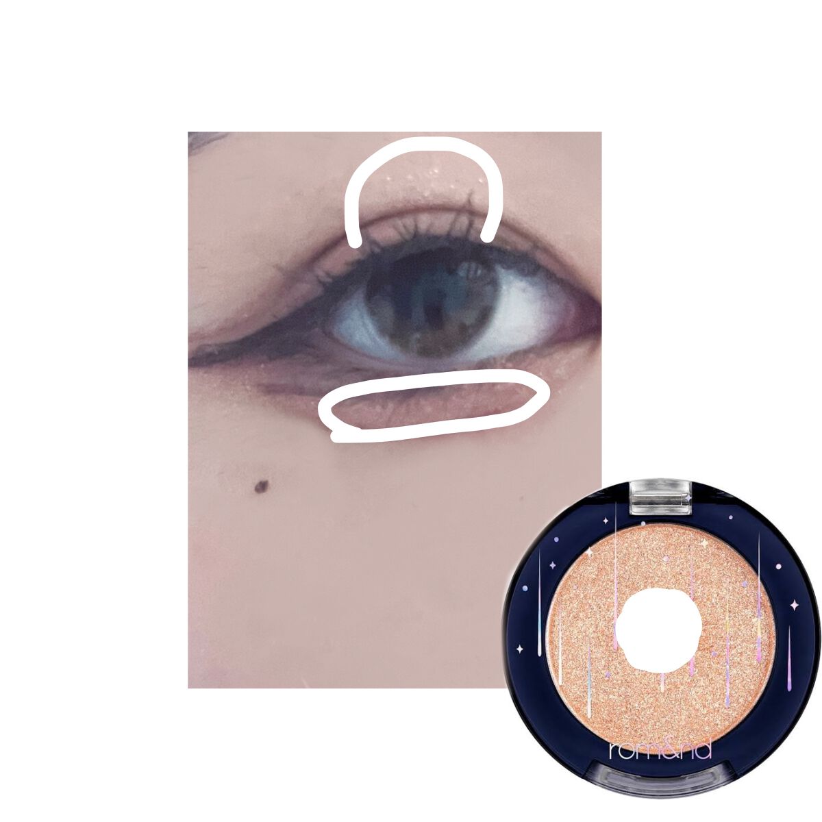デイジーク02の薄い色をアイホール全体に もう少し濃いピンクを二重幅に載せる マジョマジョのマサラチャイを涙袋にのせる キャンメイククリーミータッチライナーを涙袋の影、二重延長、地雷盛れライン、アイラインの下書きに使う!→涙袋に影や二重延長ラインは書いたら直ぐに綿棒でぼかすのが🙆♀️ D-UPナチュラルブラウンをアイラインの下書きにそって書く! (私はこの時に目の下のホクロも書いてます!) マスカラ!これがいっちばん時間かかるけど1番大事!①ビューラーであげられる所までガンガンにあげる②エチュセのマスカラ下地をまつ毛全体に塗る(束感作りたい人はここで作っておくのが楽!)③乾いたらビューラーで上げる④キャンメイクのマスカラを塗ってボリュームを出していく⑤乾いたらまたビューラーであげる! マスカラがかわいたのを確認してロムアンドのグリッター01(液体じゃない方)を上まぶた広めと涙袋に広げていく