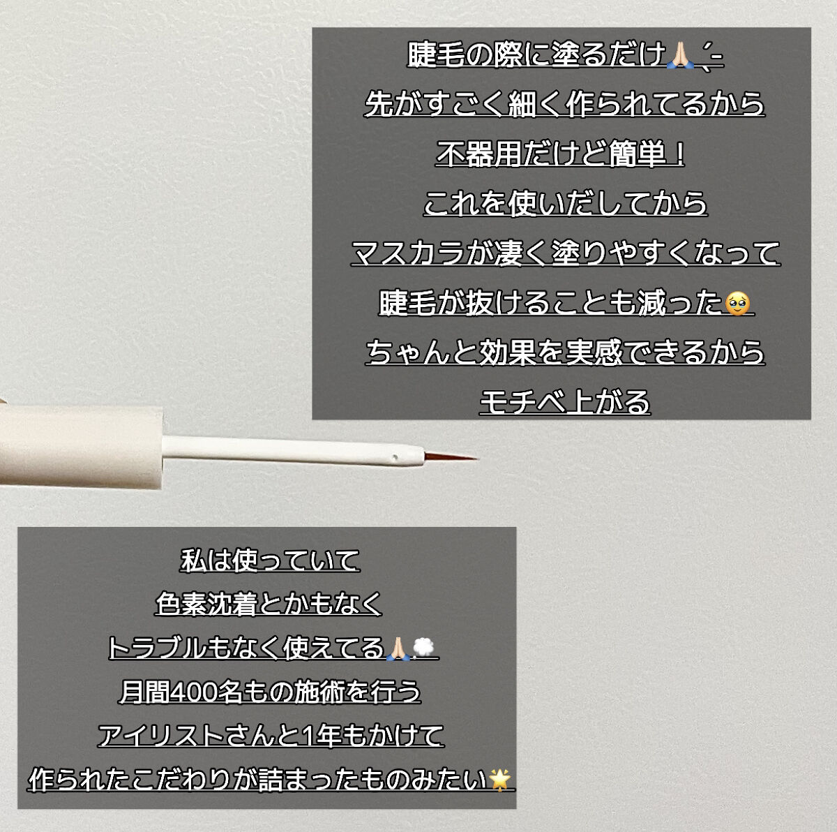 | サラサラの美容液じゃなくて少しとろみがついているからしっかりまつ毛に塗れるのも良い! | 詳細を見る | ||