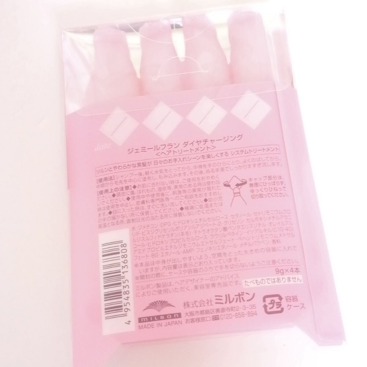 - <9g × 4> 水、ジメチコン、DPG、ヒドロキシエチルセルロース、セタノール、セトリモニウムクロリド、ビスジグリセリルポリアシルアジペート-2、グリセリン、カルボキシメチルアラニルジスルフィドケラチン(羊毛)、テトラオクタン酸ペンタエリスリチル、オレイルアルコール、ヒドロキシプロピルセルロース、ラウリルベタイン、イソアルキル(C10-40)アミドプロピルエチルジモニウムエトサルフェート、ベヘントリモニウムメトサルフェート、BG、エタノール、AMP、フェノキシエタノール、メチルパラベン、香料
