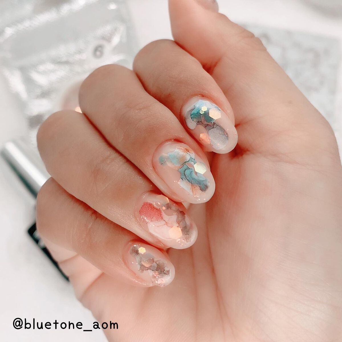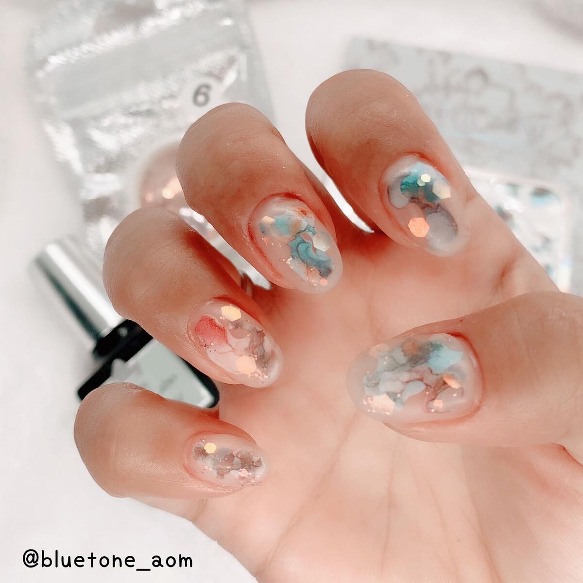 ラメがしっかりしてるし クリアカラーが入ってるから オーロラパウダー無しでも 充分キラキラしました! 反射強めのフィルムなので 実物はもっと うるうるとキラキラが強いです! ビー玉みたい🥺 ネイルシール長持ちさせたいけど ちょっと飽きてきたな〜って時とかに 全然違った印象になるのでオススメです! Seriaのベースジェル 本当にうるうるネイルしやすいので オススメしたい🙆♀️