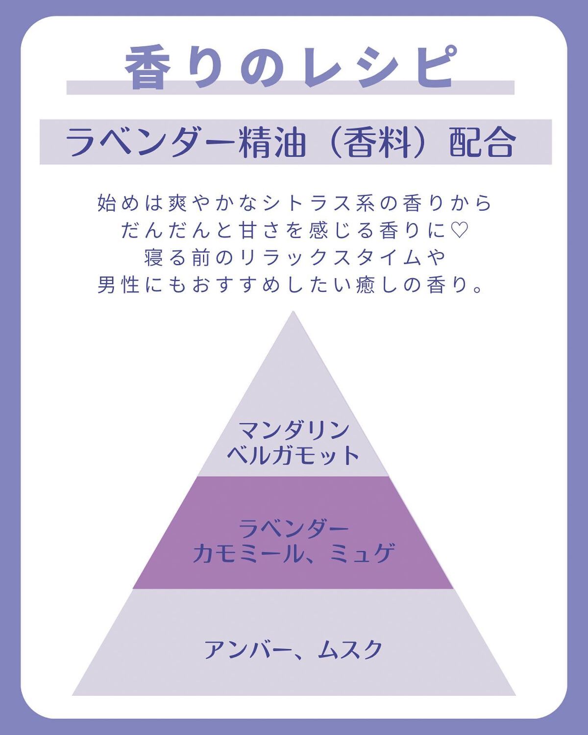 - エタノール、水、DPG、香料、ラベンダー油、レモン果皮油、オレンジ果皮油