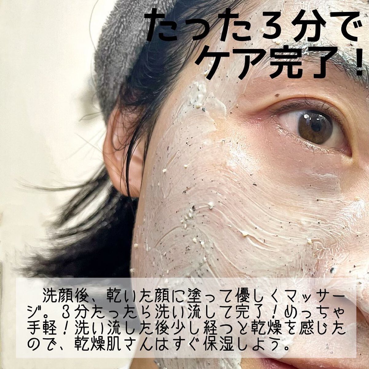 - 毛穴洗浄から角質除去まで。たった3分*1、時短毛穴ケア。 洗浄作用のある緑豆*2と6種のクレイパウダーが、毛穴に詰まった皮脂を吸着し、スッキリと除去します。 植物由来のスクラブで肌に優しい使い心地。 *1お手入れの目安時間 *2リョクトウ種子(スクラブ剤)