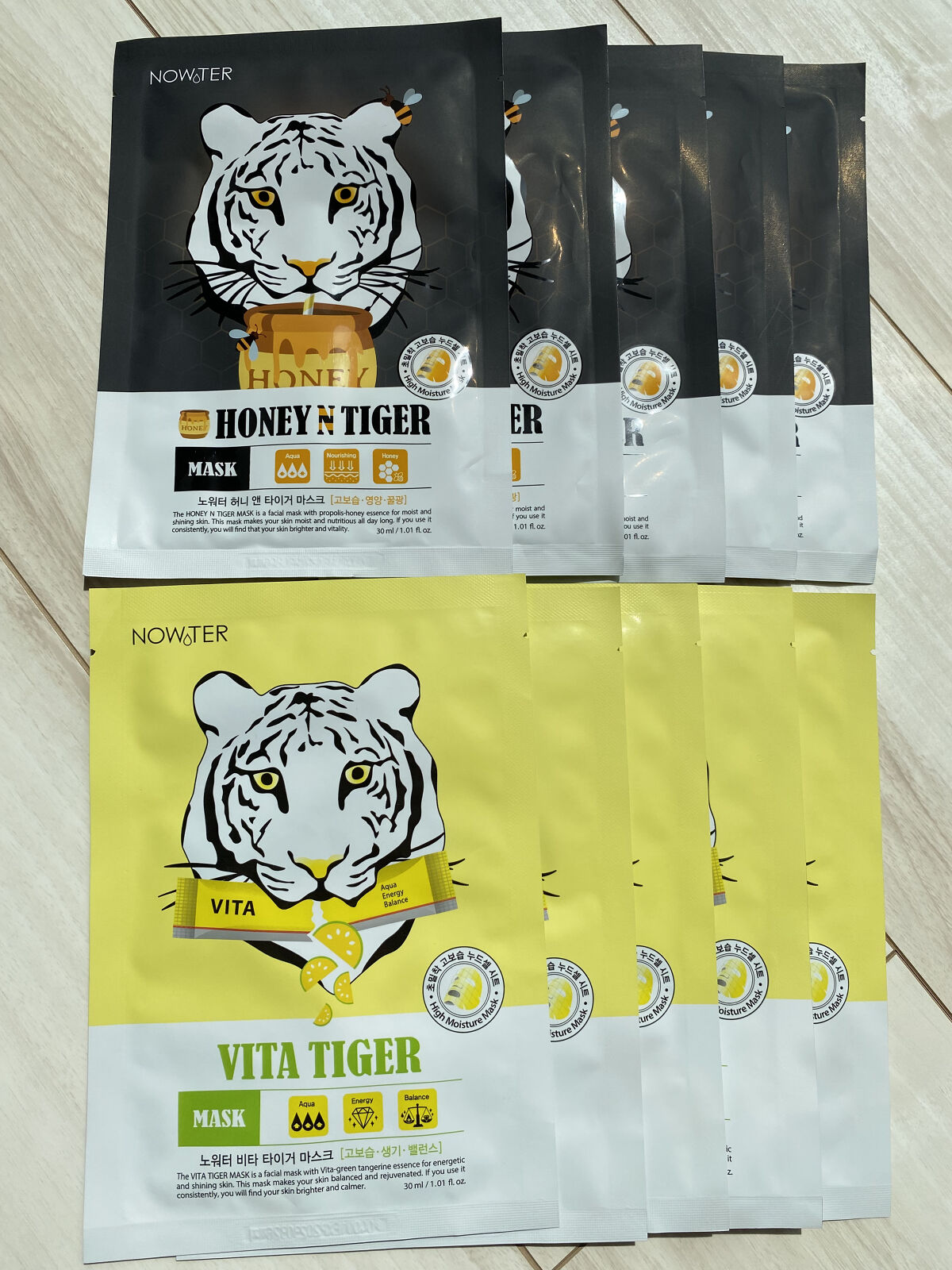 NO WATER HONEY TIGER MASKは 蜜光肌へと導くはちみつは、肌に素早く保湿を与えて多様な栄養成分が健康な肌へ導く。 ミネラル・ビタミン・アミノ酸・脂肪・有機酸・フラボノイド等の多様な栄養素を含んだプロポリスが肌美容効果を付与する。 タンパク質含有量が高く、ビタミン類が含まれているローヤルゼリーは水分および栄養供給を通して健康でしっとりした肌へとケア。 10種類のフラワーコンプレックスで美しい肌へと導く手助け。 特許を取得した《7種類の植物複合コンプレックス》でしっとり保湿と保護をサポート。 豊富な水分供給を通して肌刺激を緩和し傷を素早く回復させるツボクサ成分含有。 厚さ0.18mmのスリムヌードセルシート1枚には30mlものエッセンシャル成分が含まれる。