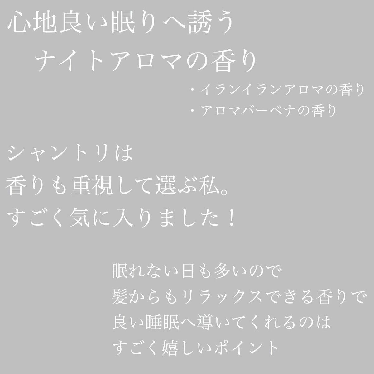 - ”寝ている間”にナノ保湿成分がしみ込み、アホ毛*・パサつきをケアするナイトケアシャンプー&ヘアトリートメント。 ナノ化した保湿成分が、夜寝ている間に髪にしみ込むので、髪を芯から潤す、うるうる髪へ導きます。 また、アイテム毎に異なるナイトアロマの心地よい香り。 シャンプー:イランイラン原料使用。アルガンオイル由来の洗浄成分で潤いを残しながらしっとり洗い上げます。イランイランアロマの香り。ノンシリコンシャンプーです。 トリートメント:バーベナ原料使用。カシミヤ由来の補修成分がしっとり包み込み、うるうる髪へ導きます。アロマバーべナの香り。 サルフェート(ラウレス硫酸Na等)・合成着色料・鉱物油・パラベン・動物実験フリー処方です。 しっとり重めの仕上がりが好きな方、髪にうるおいが欲しい方に是非使用していただきたいアイテムです。 *頭頂部から跳ね出てきてしまう短い毛
