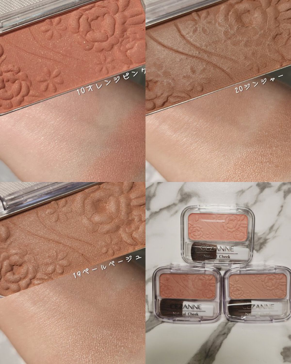 チークなんてマスクしてるからしてなかったんだけど、はずす機会も増えたので✨ 決めきれなくて全色(;^ω^) 普段使いにはベージュコーラル肌に馴染んでつやつやホッペに✨コーラルなんですが若干オレンジも デートな気分の時はゴールドピーチゴールドパールがツヤキラふんわり可愛いピンクです✨ 大人な落ち着きたいメイクの時はシナモンオレンジ落ち着いたシナモンで儚いメイクにも💡 ブラシが使いやすくてよかったです( *´•ω•`*)ノシ