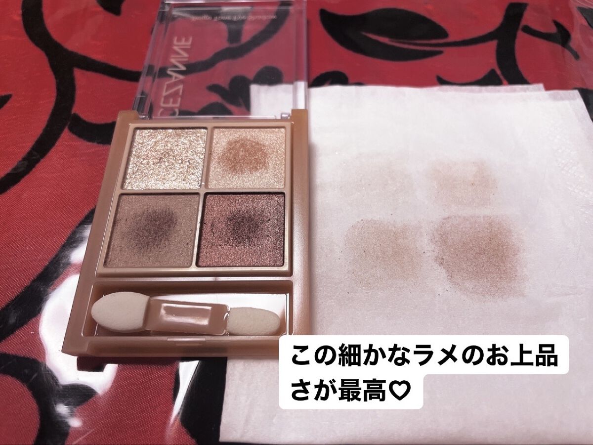 - ラメ・パール・マット3質感の4色アイシャドウ。 肌馴染みの良いベージュを基調としたカラー。ラメ・パール・マットの3質感を重ねて、自然にまぶたを強調し奥行のある大きな目元へ。 しっとり溶け込むような柔らかなパウダーなので、スルスル伸びてまぶたにピタッと密着。保湿成分(スクワラン・ホホバ種子油)配合。