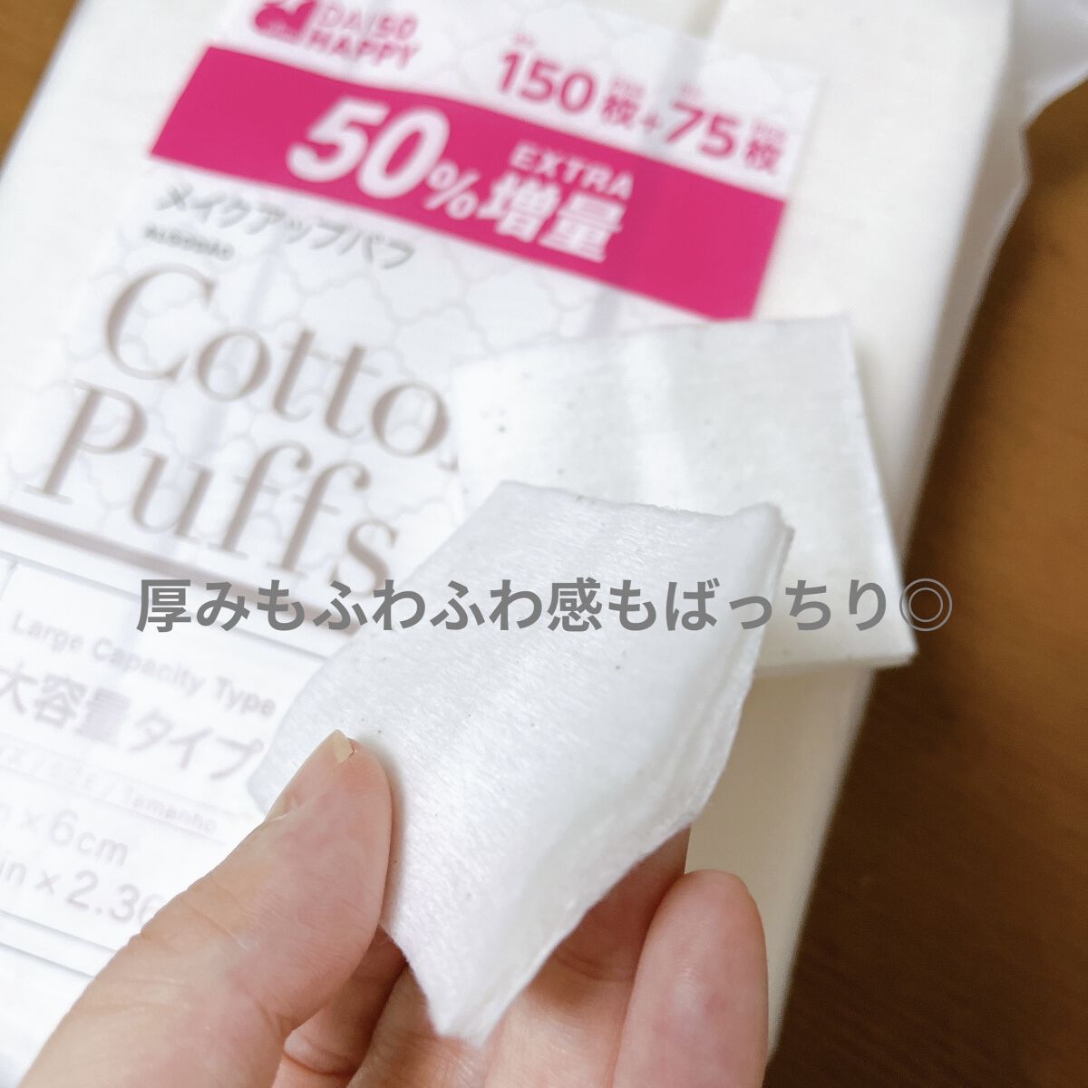 #DAISO購入品リピ決定‼️コットンパフコスパ良いアイテムをさがしていてDAISOでコットンパフ見つけました✨150枚入、コンパクトサイズでふわっとしています繊維っぽさも少しあるかもしれないですが毛羽立ちがあるわけではないので使いやすいです...
