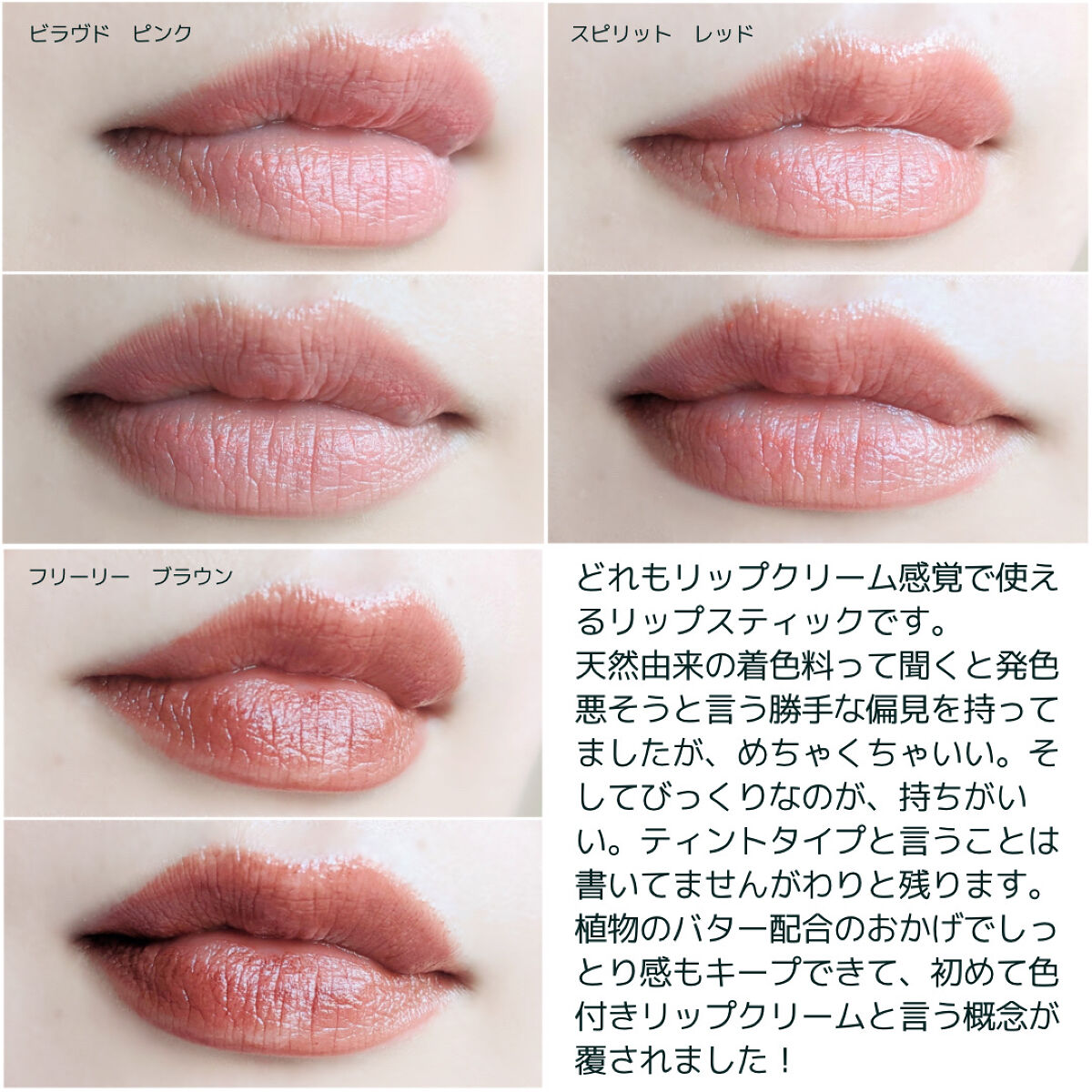 - <ビラヴド ピンク> ホホバ種子油*、ヒマシ油*、ミツロウ、ヤシ油*、シア脂*、ヒマワリ種子油、イランイラン花油*、ビターオレンジ花油*、ニオイテンジクアオイ油*、ビターオレンジ葉/枝油*、プランクトンエキス、ブドウ種子油*、プルーン種子油*、オレンジ果皮油*、トコフェロール、ベルガモット果実油*、ホホバエステル、オクチルドデカノール、トリヒドロキシステアリン、アルミナ、シリカ、酸化チタン、酸化鉄、マンガンバイオレット <スピリット レッド> ホホバ種子油*、ヒマシ油*、ミツロウ、ヤシ油*、シア脂*、ヒマワリ種子油、イランイラン花油*、ビターオレンジ花油*、ニオイテンジクアオイ油*、ビターオレンジ葉/枝油*、プランクトンエキス、ブドウ種子油*、プルーン種子油*、オレンジ果皮油*、トコフェロール、ベルガモット果実油*、ホホバエステル、オクチルドデカノール、トリヒドロキシステアリン、アルミナ、シリカ、酸化チタン、酸化鉄、マンガンバイオレット <フリーリー ブラウン> ホホバ種子油*、ヒマシ油*、ミツロウ、ヤシ油*、シア脂*、ヒマワリ種子油、イランイラン花油*、ビターオレンジ花油*、ニオイテンジクアオイ油*、ビターオレンジ葉/枝油*、プランクトンエキス、ブドウ種子油*、プルーン種子油*、オレンジ果皮油*、トコフェロール、ベルガモット果実油*、ホホバエステル、オクチルドデカノール、トリヒドロキシステアリン、アルミナ、シリカ、酸化チタン、酸化鉄