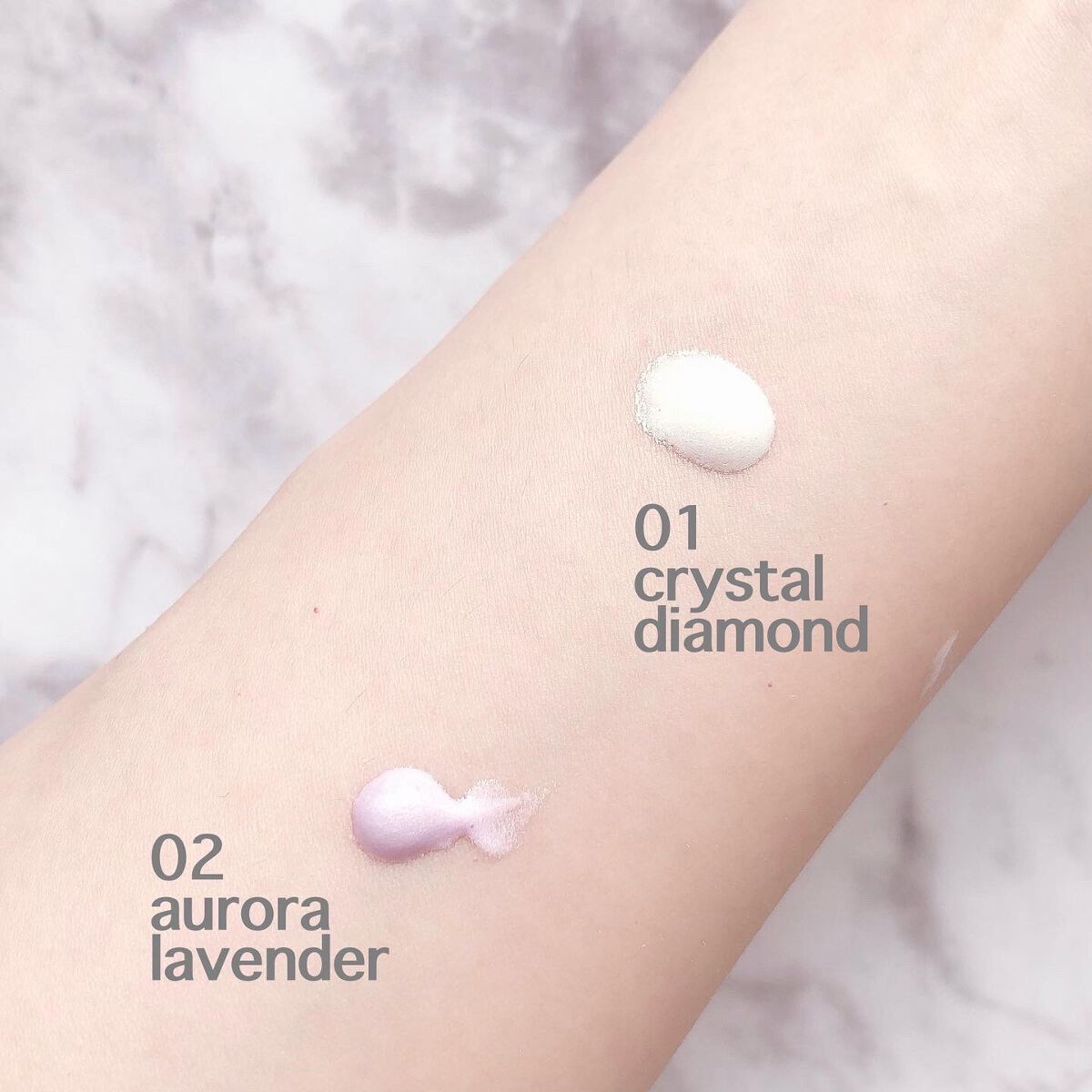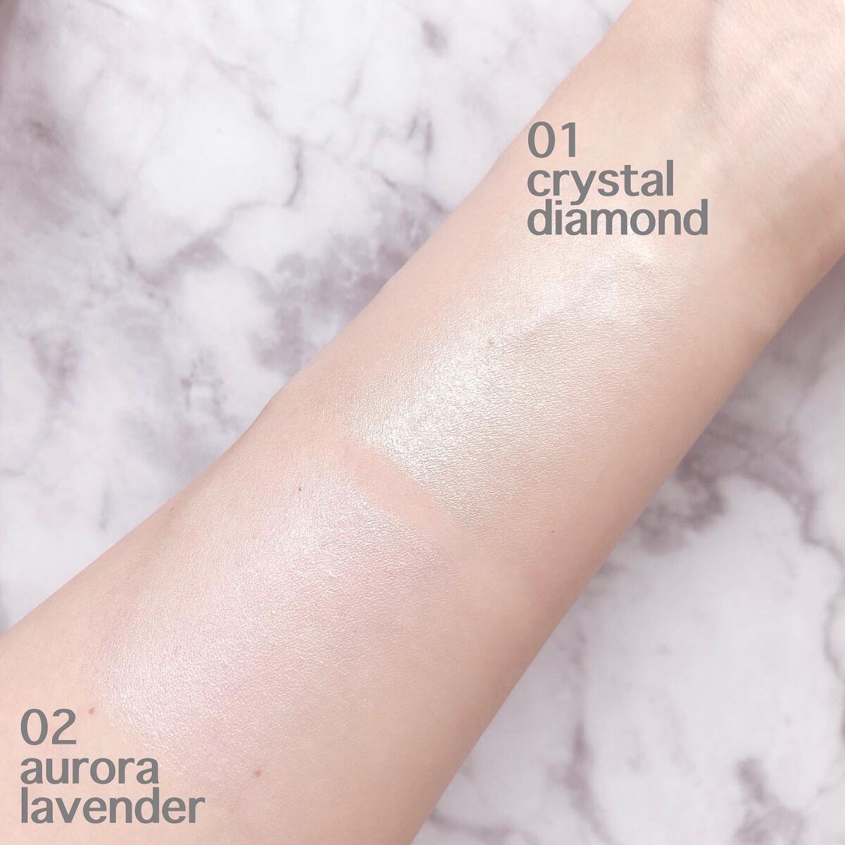- <01 crystal diamond> 水、BG、DPG、メトキシケイヒ酸エチルヘキシル、トリエチルヘキサノイン、タルク、ジメチコン、ジエチルアミノヒドロキシベンゾイル安息香酸ヘキシル、ステアリン酸、アスコフィルムノドスムエキス、アスコルビン酸、アボカドエキス、カカオ脂、キウイエキス、ゴレンシ葉エキス、ヒバマタエキス、ブドウ葉エキス、ミルシアリアデュビア果実エキス、ラミナリアクロウストニエキス、レモン果実エキス、BHT、PEG-32、PEG-6、TEA、アクリレーツコポリマー、カルボマー、シリカ、ステアリン酸グリセリル、ステアリン酸グリセリル(SE)、セスキオレイン酸ソルビタン、セテアリルアルコール、ダイヤモンド末、テトラ(ジ-t-ブチルヒドロキシヒドロケイヒ酸)ペンタエリスリチル、トリセテアレス-4リン酸、ハイドロゲンジメチコン、ポリステアリン酸スクロース、ポリソルベート80、ポリプロピレン、ヤシ油、ラウリル硫酸Na、レシチン、フェノキシエタノール、香料、マイカ、酸化チタン <02 aurora lavender> 水、BG、DPG、メトキシケイヒ酸エチルヘキシル、トリエチルヘキサノイン、ジメチコン、ジエチルアミノヒドロキシベンゾイル安息香酸ヘキシル、ステアリン酸、PEG-32、PEG-6、シリカ、アスコフィルムノドスムエキス、アスコルビン酸、アボカドエキス、カカオ脂、キウイエキス、ゴレンシ葉エキス、ヒバマタエキス、ブドウ葉エキス、ミルシアリアデュビア果実エキス、ラミナリアクロウストニエキス、レモン果実エキス、BHT、TEA、アクリレーツコポリマー、カルボマー、ステアリン酸グリセリル、ステアリン酸グリセリル(SE)、セスキオレイン酸ソルビタン、セテアリルアルコール、タルク、ダイヤモンド末、テトラ(ジ-t-ブチルヒドロキシヒドロケイヒ酸)ペンタエリスリチル、トリセテアレス-4リン酸、ポリステアリン酸スクロース、ポリソルベート80、ポリプロピレン、メチコン、ヤシ油、ラウリル硫酸Na、レシチン、フェノキシエタノール、香料、グンジョウ、マイカ、酸化チタン、酸化鉄、赤226 <03 cosmic pink> 水、BG、DPG、メトキシケイヒ酸エチルヘキシル、トリエチルヘキサノイン、ジメチコン、ジエチルアミノヒドロキシベンゾイル安息香酸ヘキシル、ステアリン酸、PEG-32、PEG-6、シリカ、アスコフィルムノドスムエキス、アスコルビン酸、アボカドエキス、カカオ脂、キウイエキス、ゴレンシ葉エキス、ヒバマタエキス、ブドウ葉エキス、ミルシアリアデュビア果実エキス、ラミナリアクロウストニエキス、レモン果実エキス、BHT、TEA、アクリレーツコポリマー、カルボマー、ステアリン酸グリセリル、ステアリン酸グリセリル(SE)、セスキオレイン酸ソルビタン、セテアリルアルコール、タルク、ダイヤモンド末、テトラ(ジ-t-ブチルヒドロキシヒドロケイヒ酸)ペンタエリスリチル、トリセテアレス-4リン酸、ポリステアリン酸スクロース、ポリソルベート80、ポリプロピレン、メチコン、ヤシ油、ラウリル硫酸Na、レシチン、フェノキシエタノール、香料、グンジョウ、マイカ、酸化チタン、酸化鉄、赤226