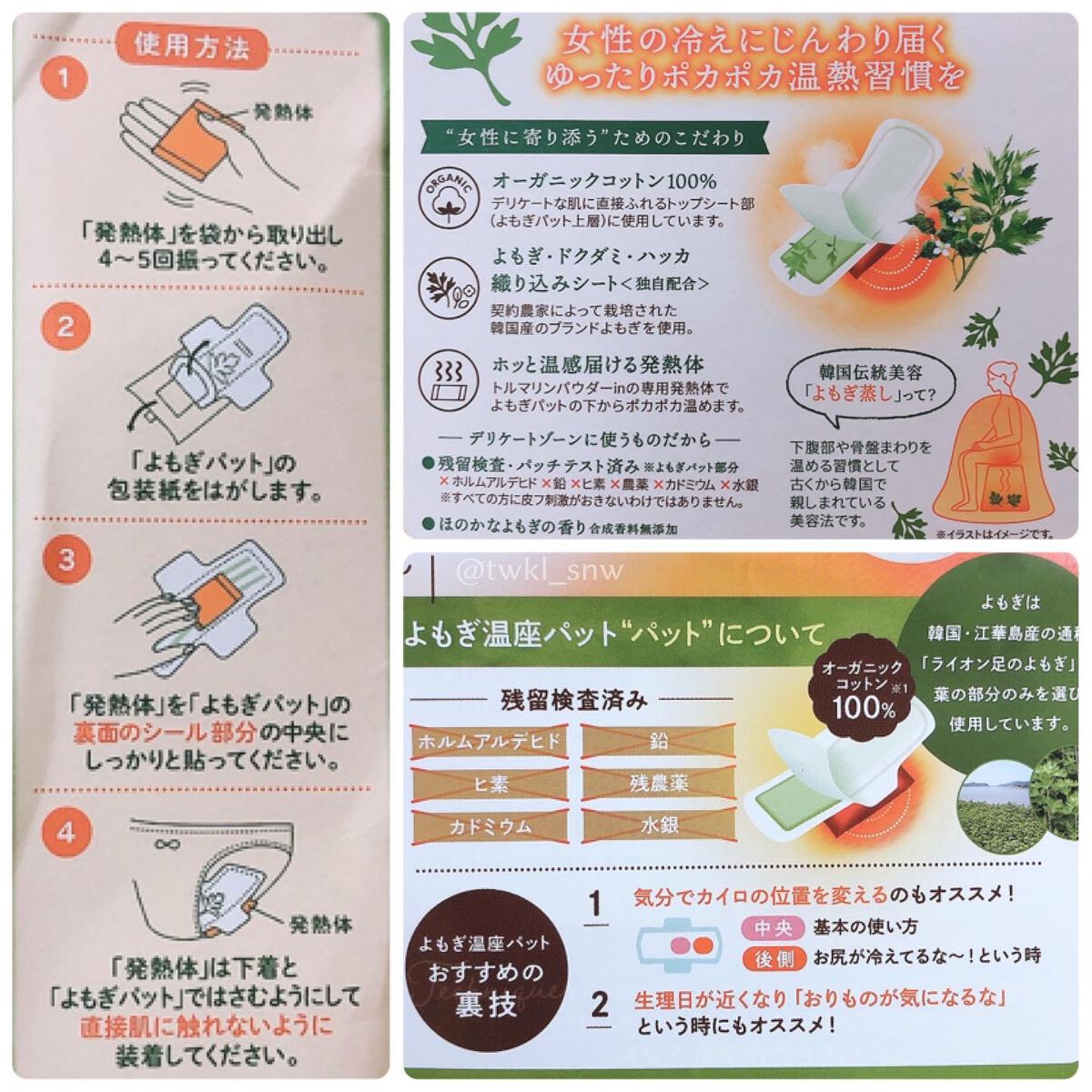 - トップシートにオーガニックコットンを使用しデリケートな肌にもやさしく心地よい肌触りに仕上げた、韓国産よもぎとドクダミ・ハッカが配合された女性のためのナプキン型温熱パットです。 ゆらぎがちな女性の日々に、温めるというアプローチで寄り添います。
