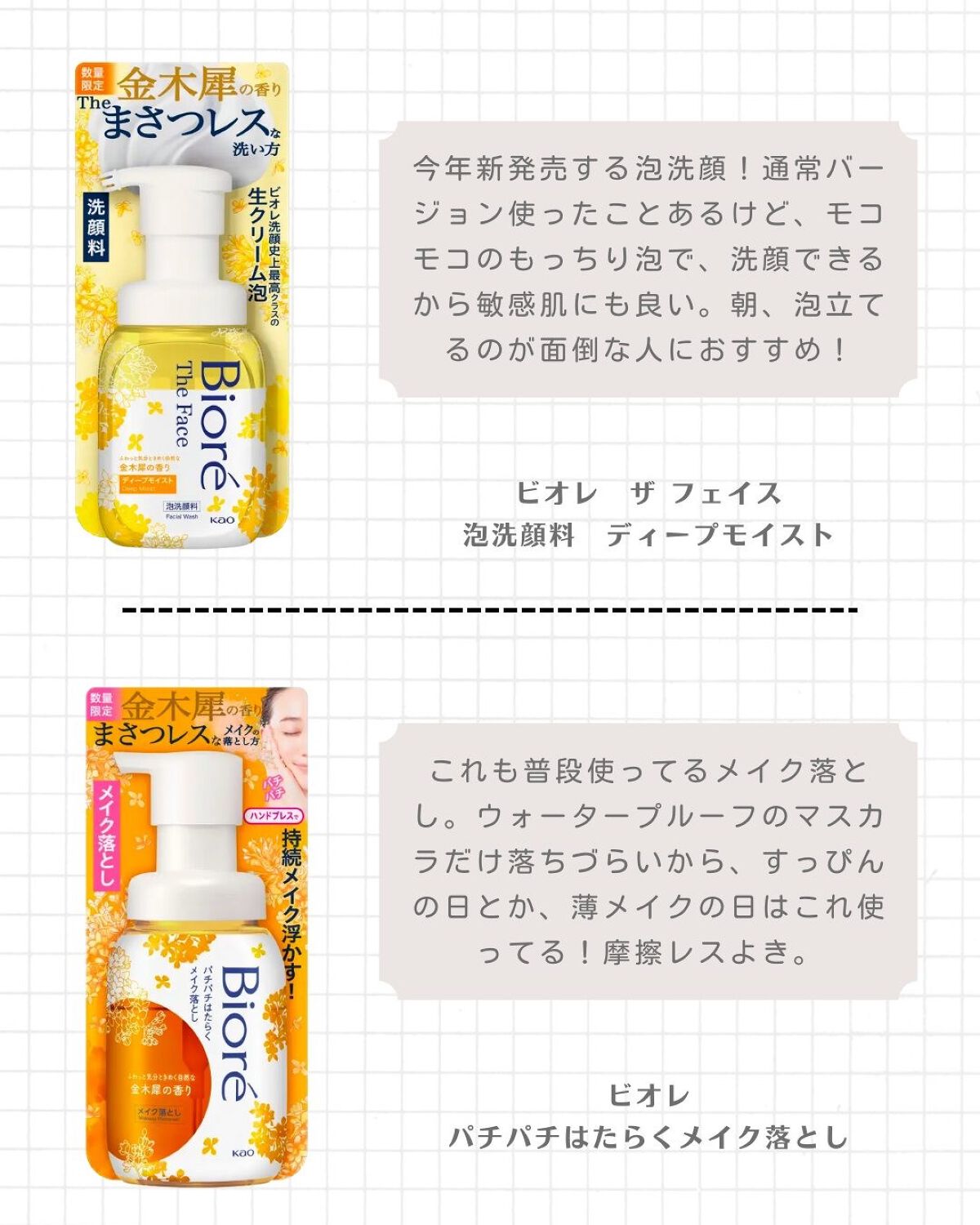 - 肌が乾燥する前に、お風呂の中でぬれたままスーッと一気にボディケア! うるおい閉じ込めたもっちり肌ざわり続く。 お風呂の中でつりさげて、立ったまま使えるつりさげパックは、置き場所をとらず、衛生的に、ムダなく使い切れる。 軽い力でカンタン液量調整できる、らくらくスイッチ採用。 ○顔までしっとり保湿 〇弱酸性 ○素肌のバリア機能の働きを補い、肌を保護する ○金木犀の香り 2023年9月9日『ビオレu ザ ボディ ぬれた肌に使うボディ乳液 金木犀の香り』は、年間を通じてご購入いただける定番品として新発売