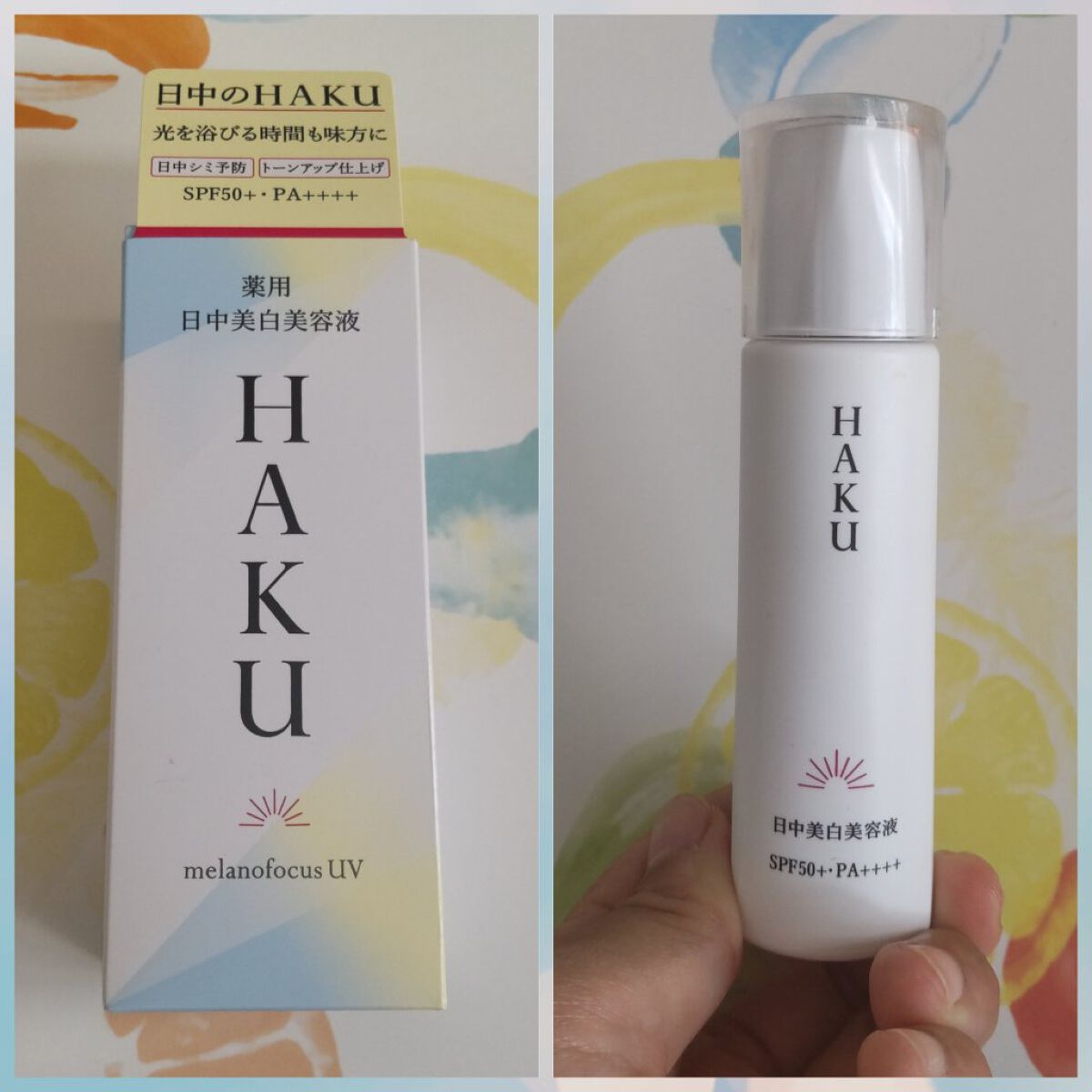 - 販売名「メラノフォーカスUV」 SPF50+・PA++++ 日中のHAKU。光を浴びる時間も味方に、日中だからできる美白ケアのアプローチ。 シミ予防研究の先端技術を搭載し、日中ならではの美白ケアを可能にした、薬用日中美白美容液です。光を浴びる時間も味方にして、明るく透明感のある肌に導きます。 ○2種の美白有効成分を肌の奥まで届け効かせる。 ○日中の肌環境に着目し、Wデイエフェクターを配合。うるおいを与え届ける。 〇ファインレッドパールαが効果的に光を放ち、シミや色ムラを目立たせない。トーンアップ効果で、明るく透明感のある仕上がり。 〇みずみずしい美容液がスーッとなじむ。化粧下地としても使える。 ○無香料・アレルギーテスト済み・ニキビのもとになりにくい処方。 (全てのかたにアレルギーが起きない、ニキビができないというわけではありません)。