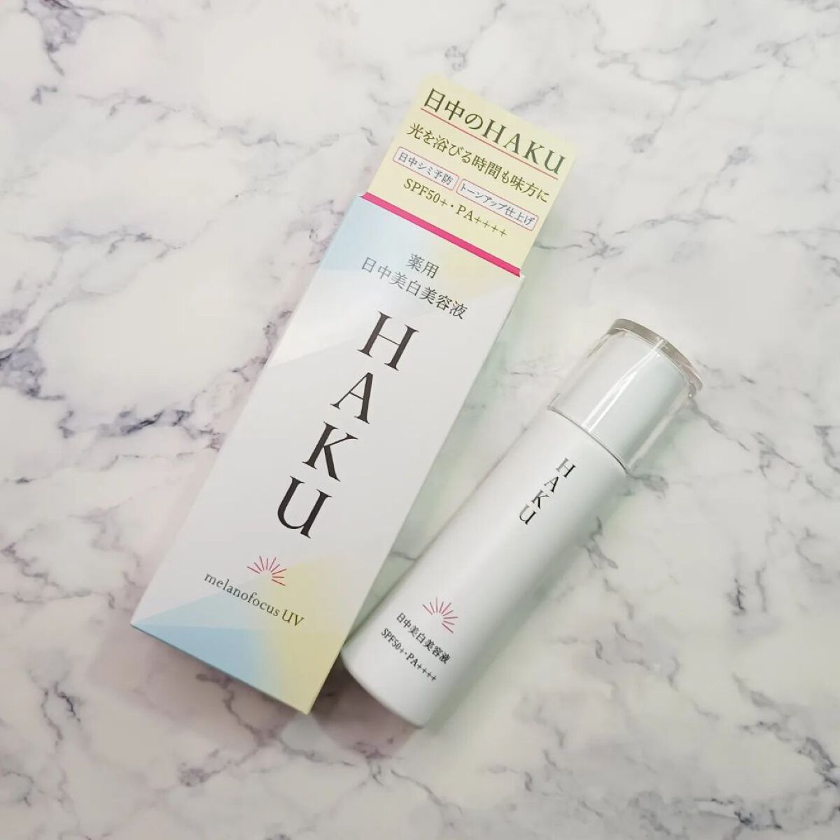 - 販売名「メラノフォーカスUV」 SPF50+・PA++++ 日中のHAKU。光を浴びる時間も味方に、日中だからできる美白ケアのアプローチ。 シミ予防研究の先端技術を搭載し、日中ならではの美白ケアを可能にした、薬用日中美白美容液です。光を浴びる時間も味方にして、明るく透明感のある肌に導きます。 ○2種の美白有効成分を肌の奥まで届け効かせる。 ○日中の肌環境に着目し、Wデイエフェクターを配合。うるおいを与え届ける。 〇ファインレッドパールαが効果的に光を放ち、シミや色ムラを目立たせない。トーンアップ効果で、明るく透明感のある仕上がり。 〇みずみずしい美容液がスーッとなじむ。化粧下地としても使える。 ○無香料・アレルギーテスト済み・ニキビのもとになりにくい処方。 (全てのかたにアレルギーが起きない、ニキビができないというわけではありません)。
