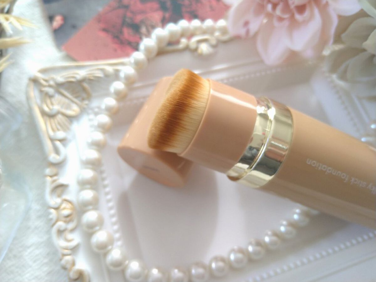 これ一本でベースメイクが完成するスティックファンデーション。ダブルエンドでファンデとブラシが一体になってるの。 ブラシは毛がびっしり!!その量なんと7万本しかもブラシの形がかわっていて、顔の骨格にあわせてカーブ型にカットされてるの。 ファンデはピタッと密着してくるし、ツヤがあるように見えるの✨保湿成分のルリジサエキスなども入っていて嬉しい♡♡♡