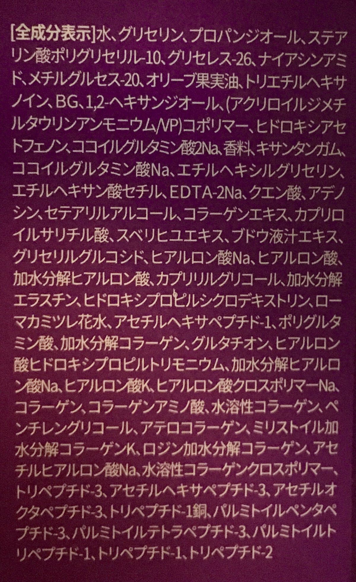 - <80ml> 水、グリセリン、プロパンジオール、ブタン、ステアリン酸ポリグリセリル-10、グリセレス-26、ナイアシンアミド、プロパン、メチルグルセス-20、オリーブ果実油、トリエチルヘキサノイン、BG、1,2-ヘキサンジオール、(アクリロイルジメチルタウリンアンモニウム/VP)コポリマー、ヒドロキシアセトフェノン、ココイルグルタミン酸2Na、香料、キサンタンガム、ココイルグルタミン酸Na、エチルヘキシルグリセリン、エチルヘキサン酸セチル、EDTA-2Na、クエン酸、アデノシン、セテアリルアルコール、コラーゲンエキス、カプリロイルサリチル酸、スベリヒユエキス、ブドウ液汁エキス、グリセリルグルコシド、ヒアルロン酸Na、ヒアルロン酸、加水分解ヒアルロン酸、カプリリルグリコール、加水分解エラスチン、ヒドロキシプロピルシクロデキストリン、ローマカミツレ花水、アセチルヘキサペプチド-1、ポリグルタミン酸、加水分解コラーゲン、グルタチオン、ヒアルロン酸ヒドロキシプロピルトリモニウム、加水分解ヒアルロン酸Na、ヒアルロン酸K、ヒアルロン酸クロスポリマーNa、コラーゲン、コラーゲンアミノ酸、水溶性コラーゲン、ペンチレングリコール、アテロコラーゲン、ミリストイル加水分解コラーゲンK、ロジン加水分解コラーゲン、アセチルヒアルロン酸Na、水溶性コラーゲンクロスポリマー、トリペプチド-3、アセチルヘキサペプチド-8、アセチルオクタペプチド-3、トリペプチド-1銅、パルミトイルペンタペプチド-3、パルミトイルテトラペプチド-3、パルミトイルトリペプチド-1、トリペプチド-1、トリペプチド-2