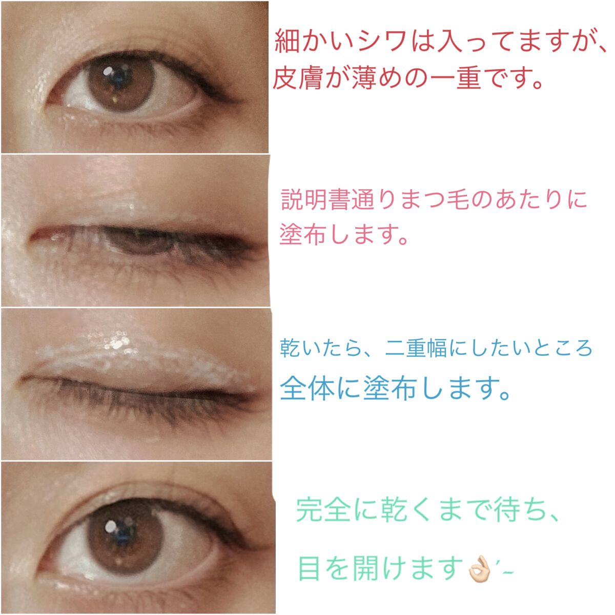 液を塗ったが部分がギュッと収縮して、透明な人工皮膜になるタイプの二重コスメ👁️✨ たるんだまぶたや伸びてしまったまぶたの方にオススメなタイプ💡 接着式としても使えて、つけまのりとしても使えるので便利です😊💖