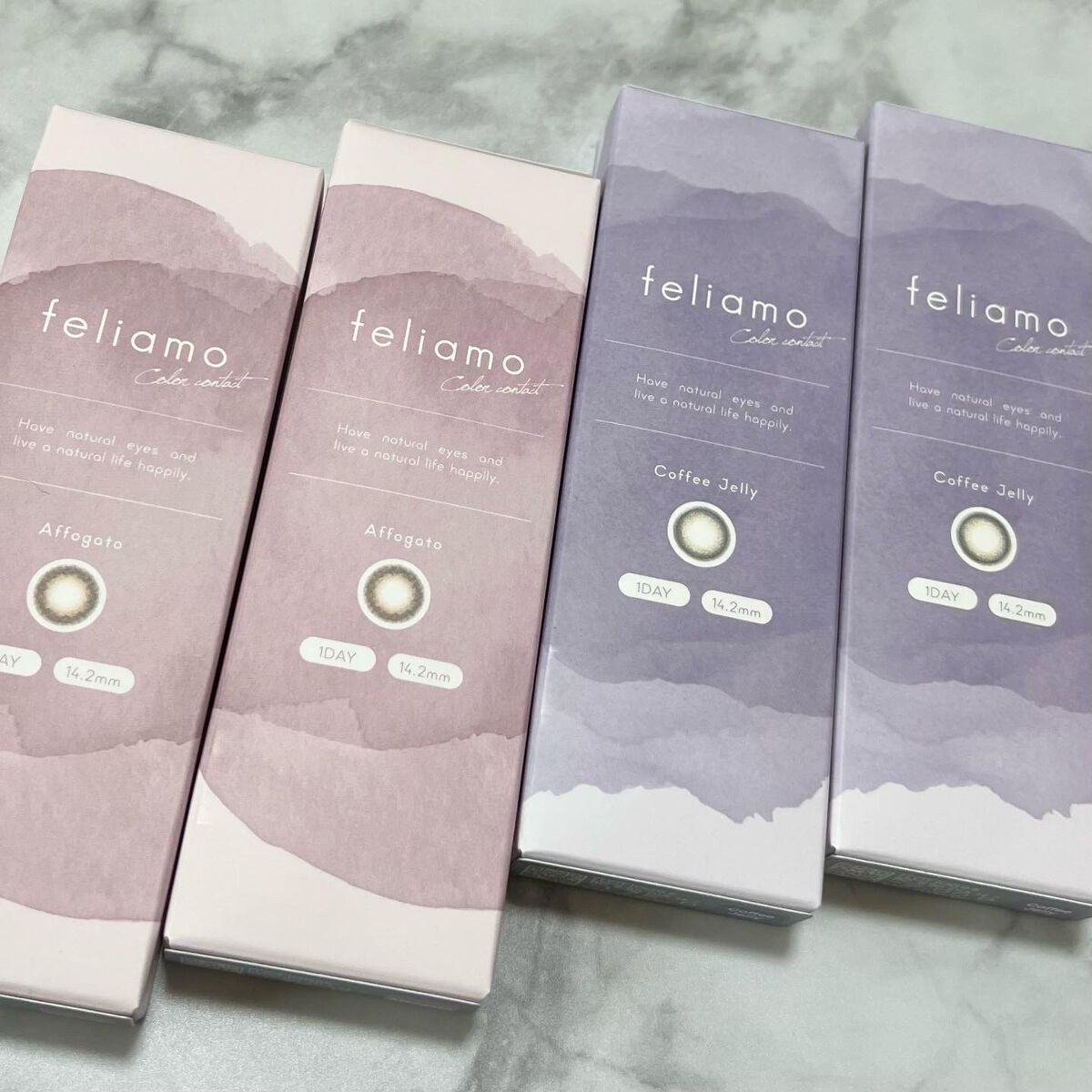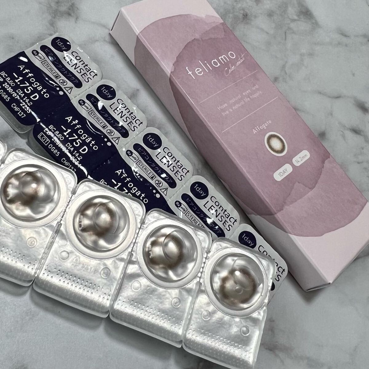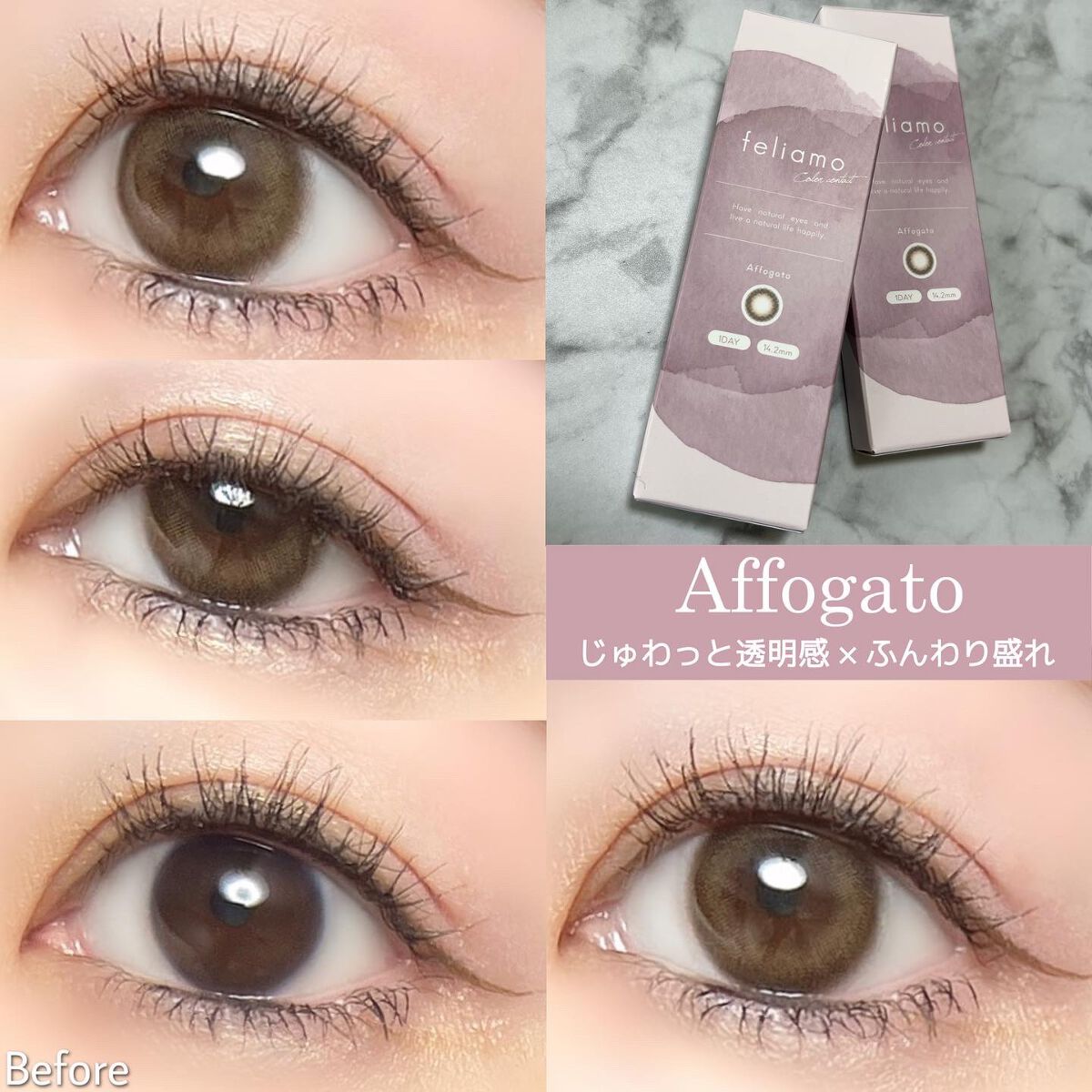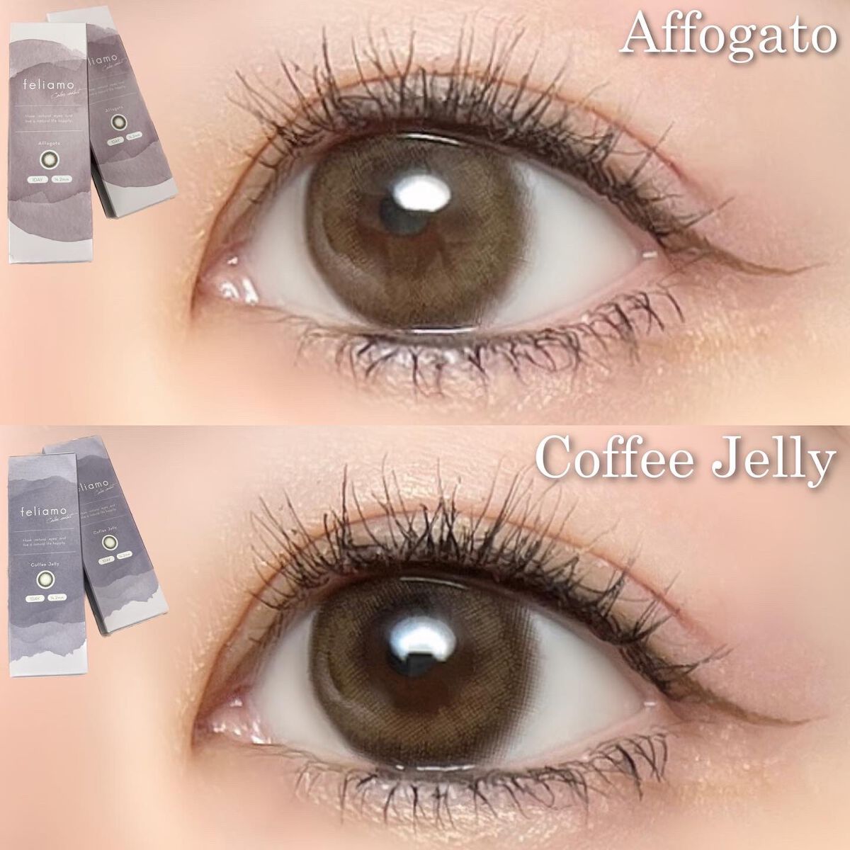 - ※2025年6月以降、商品パッケージ裏面・側面の一部表記を順次変更いたします。尚、これにかかる商品の交換・返品は承っておりません。 どんな瞬間にも溶け込む誰からも愛される瞳へ feliamoの由来は felice amore~幸せな愛~ 瞳から愛されオーラを放つ好印象レンズで女性らしさと品を演出。 オンも、オフも、特別な日も。 どんな場面にも溶け込むレンズラインナップで誰からも愛される瞳に。 UV CUT Feature1 肌や瞳に有害といわれ、白内障などの眼病を引き起こす危険性のある紫外線を99%カットします。(UV-A波75%、UV-B波99%カット) イオン性 Feature1 水分を多く含み酸素を通しやすいため瞳にやさしい使い心地で、快適な装用感です。 高含水 Feature1 水分が多く含むやわらかい素材で、快適なつけ心地です。 レンズ構造 Feature1 まぶた側に着色剤を内包しているため、角膜に色素が触れることがない構造を採用しています。 レンズ形状 Feature1 フチを丸みのある形状にすることで自然な装用感を実現しました。 ※装用感には個人差があります。 カラーコンタクトレンズの不適正使用による眼障害の危険性等などがあります。 ●コンタクトレンズは高度管理医療機器です。不十分な洗浄・消毒など不適切なケアや、長時間・交換期間を超えた装用により、アレルギー性結膜炎、角膜感染症、角膜潰瘍等の重篤な眼障害が発生する危険性があります ●ご使用前に取扱説明書を確認してください 使用上の留意事項 ●眼科医院等を受診してからお求めください ●眼に異常を感じたら直ちにレンズ使用を中止し、お近くの眼科等で診察を受けてください ●医師の指示にしたがってご使用ください ●コンタクトレンズを装用する場合、自覚症状がなくても、眼科医院等での定期検査を受けてください ●レンズに不具合がある場合は使用しないでください