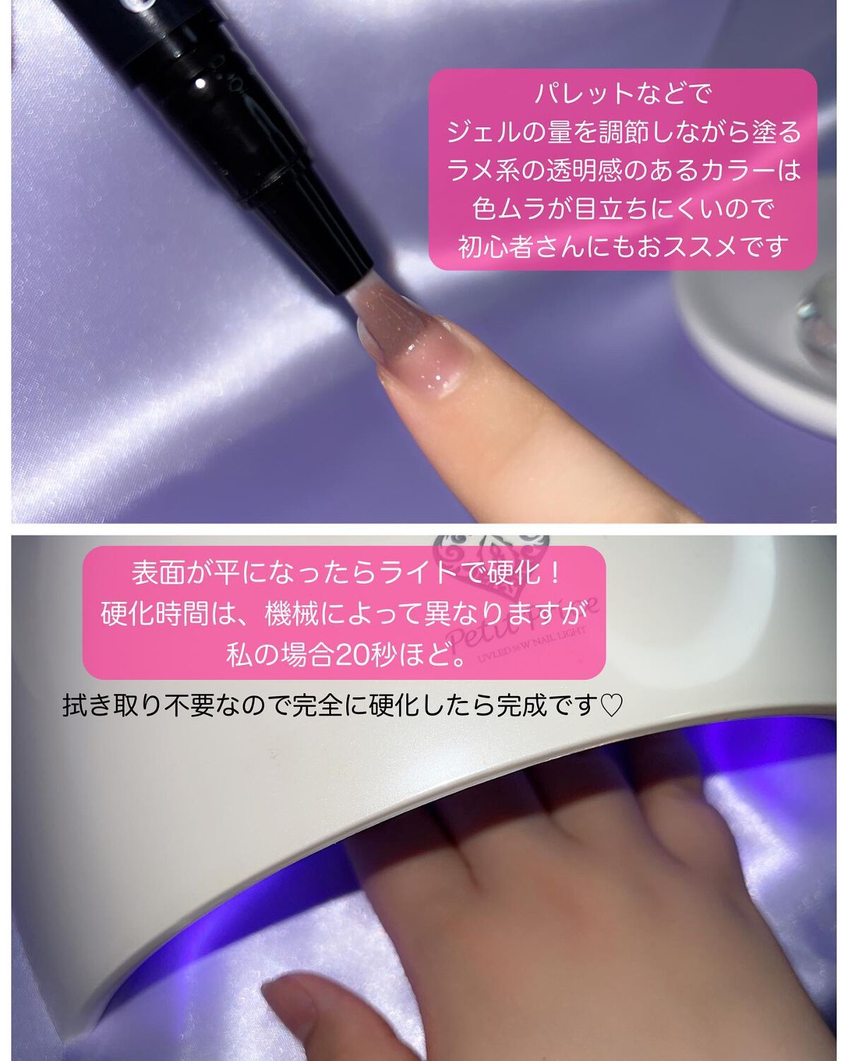 - 「ベース」「カラー」「トップ」の3つの役割を1本で果たす、便利なオールインワンジェル。ペンのような感覚で持つことができ自爪も塗りやすく、収納もコンパクト。リムーバー無しで剥がしてオフできるからその日だけネイルにもぴったりです。さらに特有の嫌なニオイがほとんどなく、パラベンやタルクなども処方されていません。誰でもネイルを楽しめます。