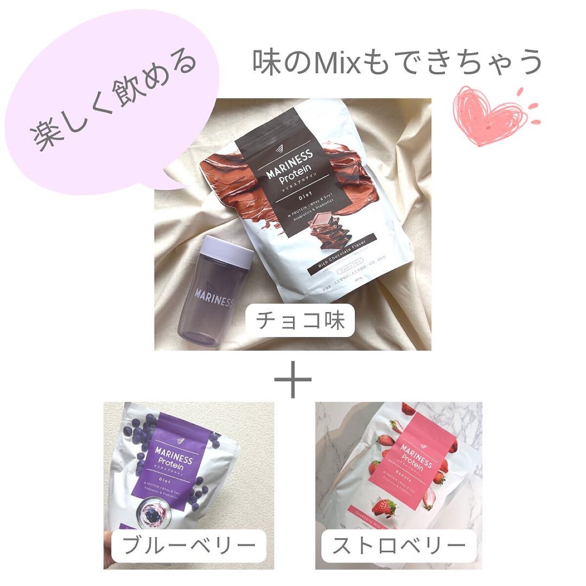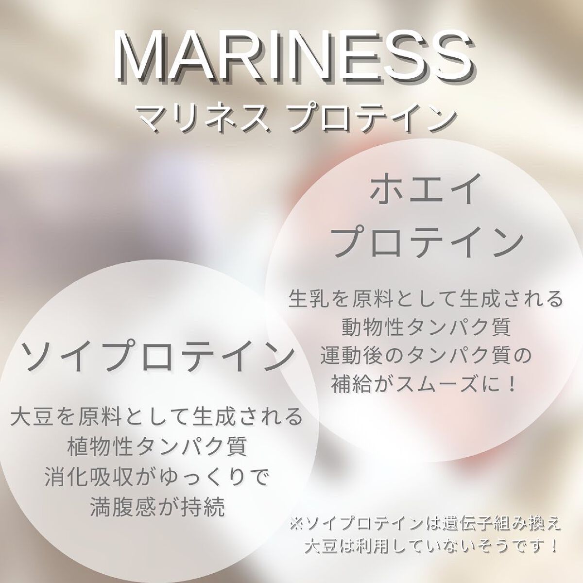私の大好きなマリネスのプロテイン! プロテインはマリネス!な我が家は今までバナナ、チョコ、ブルーベリーヨーグルト、抹茶ラテ、ロイヤルミルクティー、黒ゴマきなこほぼ全制覇するんじゃないかくらいリピートしています🥰 甘みの中に、少し酸味も感じられるので甘ったるくなく、くどくないから飲みやすい🙆♀️ マリネスのいいところは溶けやすいこと!粉っぽさがなく良き◎腹持ちの良さも◎置き換えしたい人にもいい🙌