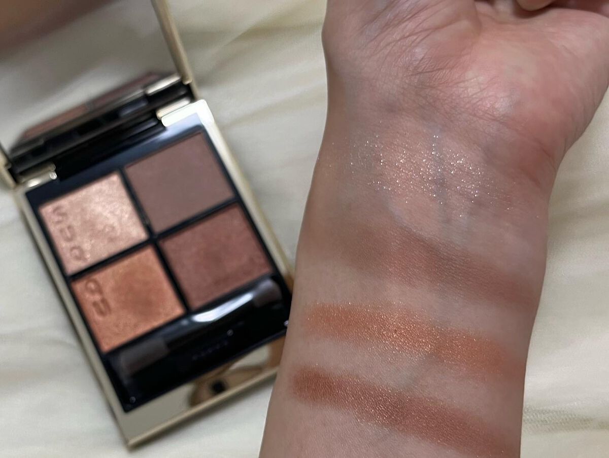 本当にもっと早く買っておけばよかったと思います🤦♀️ 今までアイシャドウは色で魅せるもの!と思っていましたがこちらのアイシャドウは質感で魅せるというか...かなり透明感が出ます。 発色もかなり薄くてスウォッチも何度も重ね塗りしてやっと色味が出ました。 一番上のクリームタイプ(ピンク)がほぼ色が出ないんですけどのせると目元にぱっと明るさを出してくれて良い仕事をしてくれるんです。 そして、重ねてけば重ねていくほど美しさが増していく。左下と右下の色味を重ねるとくすみそうですが全くくすまず...そして透け感も保たれたまま... 本当に上品で高級感のある目元にしてくれる極上のアイシャドウパレットです♡ オンでもオフでも使えるのでコスパは良いのではないでしょうか。 他の色も絶対にゲットします💘