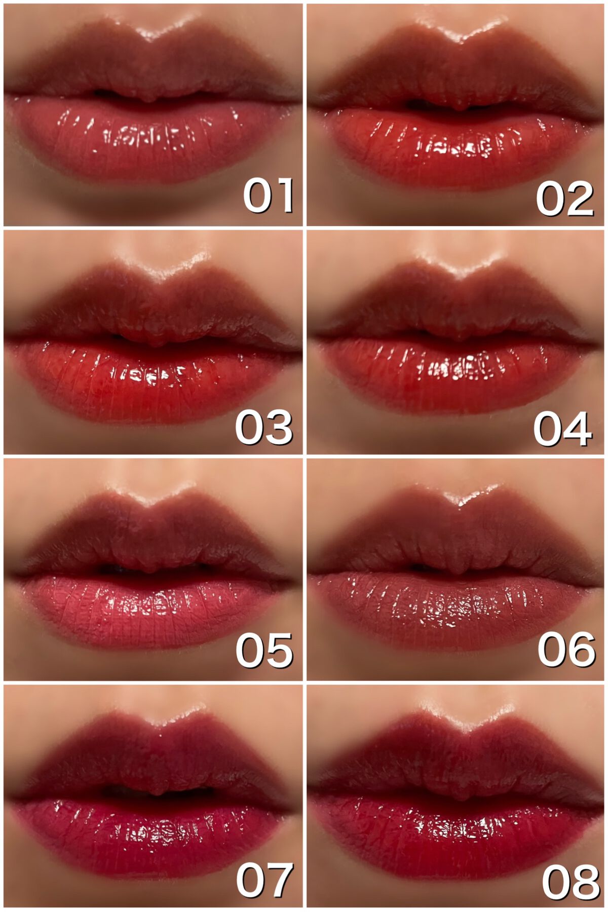 - <01 オウンピンク> ジフェニルジメチコン、水、リンゴ酸ジイソステアリル、ビスジグリセリルポリアシルアジペート-2、オクチルドデカノール 水添ポリイソブテン、セチルPEG/PPG-10/1ジメチコン、BG、イソステアリン酸ソルビタン、ポリソルベート60 ペンチレングリコール、(アクリル酸ヒドロキシエチル/アクリロイルジメチルタウリンNa)コポリマー セテアレス-20、酸化チタン、スクワラン、フェノキシエタノール、ステビオシド、赤色227号、黄色4号、香料、オクトキシグリ セリン、赤色104号の(1)、青色1号 <02 コーラルグラッセ> ジフェニルジメチコン、水、リンゴ酸ジイソステアリル、ビスジグリセリルポリアシルアジペート-2、オクチルドデカノール、水添ポリイソブテン、ダイマージリノール酸ダイマージリノレイルビス (ベヘニル/イソステアリル/フィトステリル)、グ リセリン、セチルPEG/PPG-10/1ジメチコン、BG、イソステアリン酸ソルビタン、ポリソルベート60、ペンチレング リコール、(アクリル酸ヒドロキシエチル/アクリロイルジメチルタウリンNa)コポリマー、セテアレス-20、スクワラン、酸 化チタン、フェノキシエタノール、ステビオシド、赤色227号、黄色4号、香料、オクトキシグリセリン、黄色5号 <03 ウィークエンド> ジフェニルジメチコン、水、リンゴ酸ジイソステアリル、ビスジグリセリルポリアシルアジペート-2、オクチルドデカノール、水添ポリイソブテン、ダイマージリノール酸ダイマージリノレイルビス(ベヘニル/イソステアリル/フィトステリル)、グリ セリン、セチルPEG/PPG-10/1ジメチコン、BG、イソステアリン酸ソルビタン、ポリソルベート60,ペンチレングリ コール、(アクリル酸ヒドロキシエチル/アクリロイルジメチルタウリンNa)コポリマー、セテアレス-20、スクワラン、フェ ノキシエタノール、黄色5号、ステビオシド、赤色227号,香料、オクトキシグリセリン、赤色104号の (1) <04 バーントチリ> ジフェニルジメチコン、水、リンゴ酸ジイソステアリル、ビスジグリセリルポリアシルアジペート-2、オクチルドデカノール、水添ポリイソブテン、ダイマージリノール酸ダイマージリノレイルビス (ベヘニル/イソステアリル/フィトステリル)、グリセリン、BG、セチルPEG/PPG-10/1ジメチコン、イソステアリン酸ソルビタン、ポリソルベート60、ペンチレング リコール、(アクリル酸ヒドロキシエチル/アクリロイルジメチルタウリンNa)コポリマー、セテアレス-20、スクワラン、フフェノキシエタノール、赤色227号、黄色4号、ステビオシド、C177491、香料、オクトキシグリセリン、青色1号、ポリアクリル酸 アンモニウム <05 ウィンディ> ジフェニルジメチコン、水、リンゴ酸ジイソステアリル、ビスジグリセリルポリアシルアジペート-2、オクチルドデカノール 水添ポリイソブテン、ダイマージリノール酸ダイマージリノレイルビス(ベヘニル/イソステアリル/フィトステリル)、グ リセリン、BG、セチルPEG/PPG-10/1ジメチコン、イソステアリン酸ソルビタン、ポリソルベート60、ペンチレング リコール、(アクリル酸ヒドロキシエチル/アクリロイルジメチルタウリンNa)コポリマー、セテアレス-20,酸化チタン、スクワラン、フェノキシエタノール、ステビオシド、赤色227号、黄色5号,香料、オクトキシグリセリン、赤色104号の (1)、水酸 化Al、ポリアクリル酸アンモニウム、黄色4号 <06 モーヴモア> ジフェニルジメチコン、水、リンゴ酸ジイソステアリル、ビスジグリセリルポリアシルアジペート-2、オクチルドデカノール,グリセリン、水添ポリイソブテン、ダイマージリノール酸ダイマージリノレイルビス (ベヘニル/イソステアリル/フィトステリル)、セ チルPEG/PPG-10/1ジメチコン、BG、イソステアリン酸ソルビタン、ポリソルベート60,ペンチレングリコール、酸化チタン、(アクリル酸ヒドロキシエチル/アクリロイルジメチルタウリンNa)コポリマー、セテアレス-20、スクワラン、フェノキシエ タノール、ステビオシド、黄色4号、赤色227号、香料、オクトキシグリセリン、赤色104号の(1)、黄色5号、青色1号 <07 プラミー> ジフェニルジメチコン、水、リンゴ酸ジイソステアリル、ビスジグリセリルポリアシルアジペート-2、オクチルドデカノール、水添ポリイソブテン、ダイマージリノール酸ダイマージリノレイルビス(ベヘニル/イソステアリル/フィトステリル)、グリセリン、セチルPEG/PPG-10/1ジメチコン、BG、イソステアリン酸ソルビタン、ポリソルベート60,ペンチレングリコール、(アクリル酸ヒドロキシエチル/アクリロイルジメチルタウリンNa)コポリマー、セテアレス-20,スクワラン、フ フェノキシエタノール、赤色104号の(1)、赤色227号、ステビオシド、黄色5号,香料、オクトキシグリセリン、青色1号 <08 コールドチェリ> ジフェニルジメチコン、水、リンゴ酸ジイソステアリル、ビスジグリセリルポリアシルアジペート-2、オクチルドデカノール 水添ポリイソブテン、ダイマージリノール酸ダイマージリノレイルビス (ベヘニル/イソス