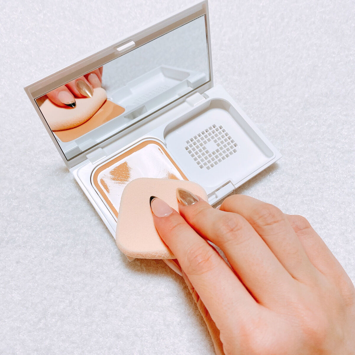 私の悩みは【毛穴やほうれい線に溜まり、くすんでしまう】ことでした。 4種類あるクッションは、それぞれ役割が全く異っていて、【使い分けて】【使いこなす】のが重要! ①モイスチャー一番オイルっぽい。王道のツヤです🌙 ②ネオカバー水光肌っぽいみずみずしいツヤ✨ ③プロカバーエイジングケアも担う美容液効果がすごいのが、プロカバー🫡 ④マット粒子が細かいので繊細な立体感を出せます🍑 ★正中線上のおでこと小鼻はマット、頬の一番きれいに見せたいところはモイスチャーという風に組み合わせるテクニックは女優さんに実際にされているメイクなんだそう🥹💕
