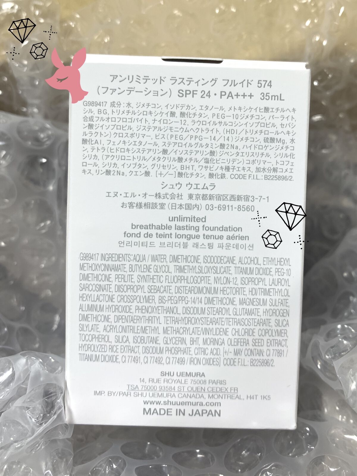- <375> 水、ジメチコン、イソドデカン、エタノール、メトキシケイヒ酸エチルヘキシル、BG、トリメチルシロキシケイ酸、酸化チタン、PEG-10ジメチコン、パーライト、合成フルオロフロゴバイト、ナイロン-12、ラウロイルサルコシンイソプロピル、セバシン酸ジイソプロピル、ジステアルジモニウムヘクトライト、(HDI/トリメチロールヘキシルラクトン)クロスポリマー、ビス(PEG/PPG-14/14)ジメチコン、硫酸Mg、水酸化AI、フェノキシエタノール、ステアロイルグルタミン酸2Na、ハイドロゲンジメチコン、テトラ(ヒドロキシステアリン酸/イソステアリン酸)ジベンタエリスリチル、シリル化シリカ、(アクリロニトリル/メタクリル酸メチル/塩化ビニリデン) コポリマー、トコフェロール、シリカ、イソブタン、グリセリン、BHT、ワサビノキ種子エキス、加水分解コメエキス、リン酸2Na、クエン酸、〔+/-〕酸化チタン、酸化鉄 <453> 水、ジメチコン、イソドデカン、エタノール、メトキシケイヒ酸エチルヘキシル、BG、トリメチルシロキシケイ酸、酸化チタン、PEG-10ジメチコン、パーライト、合成フルオロフロゴバイト、ナイロン-12、ラウロイルサルコシンイソプロピル、セバシン酸ジイソプロピル、ジステアルジモニウムヘクトライト、(HDI/トリメチロールヘキシルラクトン)クロスポリマー、ビス(PEG/PPG-14/14)ジメチコン、硫酸Mg、水酸化AI、フェノキシエタノール、ステアロイルグルタミン酸2Na、ハイドロゲンジメチコン、テトラ(ヒドロキシステアリン酸/イソステアリン酸)ジベンタエリスリチル、シリル化シリカ、(アクリロニトリル/メタクリル酸メチル/塩化ビニリデン) コポリマー、トコフェロール、シリカ、イソブタン、グリセリン、BHT、ワサビノキ種子エキス、加水分解コメエキス、リン酸2Na、クエン酸、〔+/-〕酸化チタン、酸化鉄 <463> 水、ジメチコン、イソドデカン、エタノール、メトキシケイヒ酸エチルヘキシル、BG、トリメチルシロキシケイ酸、酸化チタン、PEG-10ジメチコン、パーライト、合成フルオロフロゴバイト、ナイロン-12、ラウロイルサルコシンイソプロピル、セバシン酸ジイソプロピル、ジステアルジモニウムヘクトライト、(HDI/トリメチロールヘキシルラクトン)クロスポリマー、ビス(PEG/PPG-14/14)ジメチコン、硫酸Mg、水酸化AI、フェノキシエタノール、ステアロイルグルタミン酸2Na、ハイドロゲンジメチコン、テトラ(ヒドロキシステアリン酸/イソステアリン酸)ジベンタエリスリチル、シリル化シリカ、(アクリロニトリル/メタクリル酸メチル/塩化ビニリデン) コポリマー、トコフェロール、シリカ、イソブタン、グリセリン、BHT、ワサビノキ種子エキス、加水分解コメエキス、リン酸2Na、クエン酸、〔+/-〕酸化チタン、酸化鉄 <474> 水、ジメチコン、イソドデカン、エタノール、メトキシケイヒ酸エチルヘキシル、BG、トリメチルシロキシケイ酸、酸化チタン、PEG-10ジメチコン、パーライト、合成フルオロフロゴバイト、ナイロン-12、ラウロイルサルコシンイソプロピル、セバシン酸ジイソプロピル、ジステアルジモニウムヘクトライト、(HDI/トリメチロールヘキシルラクトン)クロスポリマー、ビス(PEG/PPG-14/14)ジメチコン、硫酸Mg、水酸化AI、フェノキシエタノール、ステアロイルグルタミン酸2Na、ハイドロゲンジメチコン、テトラ(ヒドロキシステアリン酸/イソステアリン酸)ジベンタエリスリチル、シリル化シリカ、(アクリロニトリル/メタクリル酸メチル/塩化ビニリデン) コポリマー、トコフェロール、シリカ、イソブタン、グリセリン、BHT、ワサビノキ種子エキス、加水分解コメエキス、リン酸2Na、クエン酸、〔+/-〕酸化チタン、酸化鉄 <484> 水、ジメチコン、イソドデカン、エタノール、メトキシケイヒ酸エチルヘキシル、BG、トリメチルシロキシケイ酸、酸化チタン、PEG-10ジメチコン、パーライト、合成フルオロフロゴバイト、ナイロン-12、ラウロイルサルコシンイソプロピル、セバシン酸ジイソプロピル、ジステアルジモニウムヘクトライト、(HDI/トリメチロールヘキシルラクトン)クロスポリマー、ビス(PEG/PPG-14/14)ジメチコン、硫酸Mg、水酸化AI、フェノキシエタノール、ステアロイルグルタミン酸2Na、ハイドロゲンジメチコン、テトラ(ヒドロキシステアリン酸/イソステアリン酸)ジベンタエリスリチル、シリル化シリカ、(アクリロニトリル/メタクリル酸メチル/塩化ビニリデン) コポリマー、トコフェロール、シリカ、イソブタン、グリセリン、BHT、ワサビノキ種子エキス、加水分解コメエキス、リン酸2Na、クエン酸、〔+/-〕酸化チタン、酸化鉄 <534> 水、ジメチコン、イソドデカン、エタノール、メトキシケイヒ酸エチルヘキシル、BG、トリメチルシロキシケイ酸、酸化チタン、PEG-10ジメチコン、パーライト、合成フルオロフロゴバイト、ナイロン-12、ラウロイルサルコシンイソプロピル、セバシン酸ジイソプロピル、ジステアルジモニウムヘクトライト、(HDI/トリメチロールヘキシルラクトン)クロスポリマー、ビス(PEG/PPG