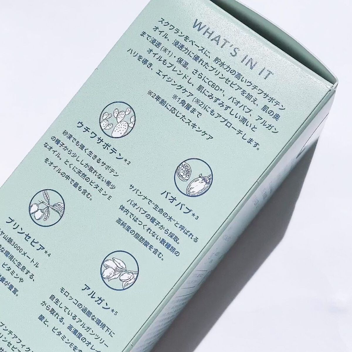 - 高い保湿力を持ちながら、さらっとした使い心地の美容オイル。スクワランをベースに、CBD、植物性由来のウチワサボテン、バオバブ、アルガンなどの保湿成分を加え、肌の隅々(角質層)まで浸透・保湿。肌にみずみずしい潤いとハリを導き、エイジングケア*にもアプローチします。 *年齢に応じたお手入れ