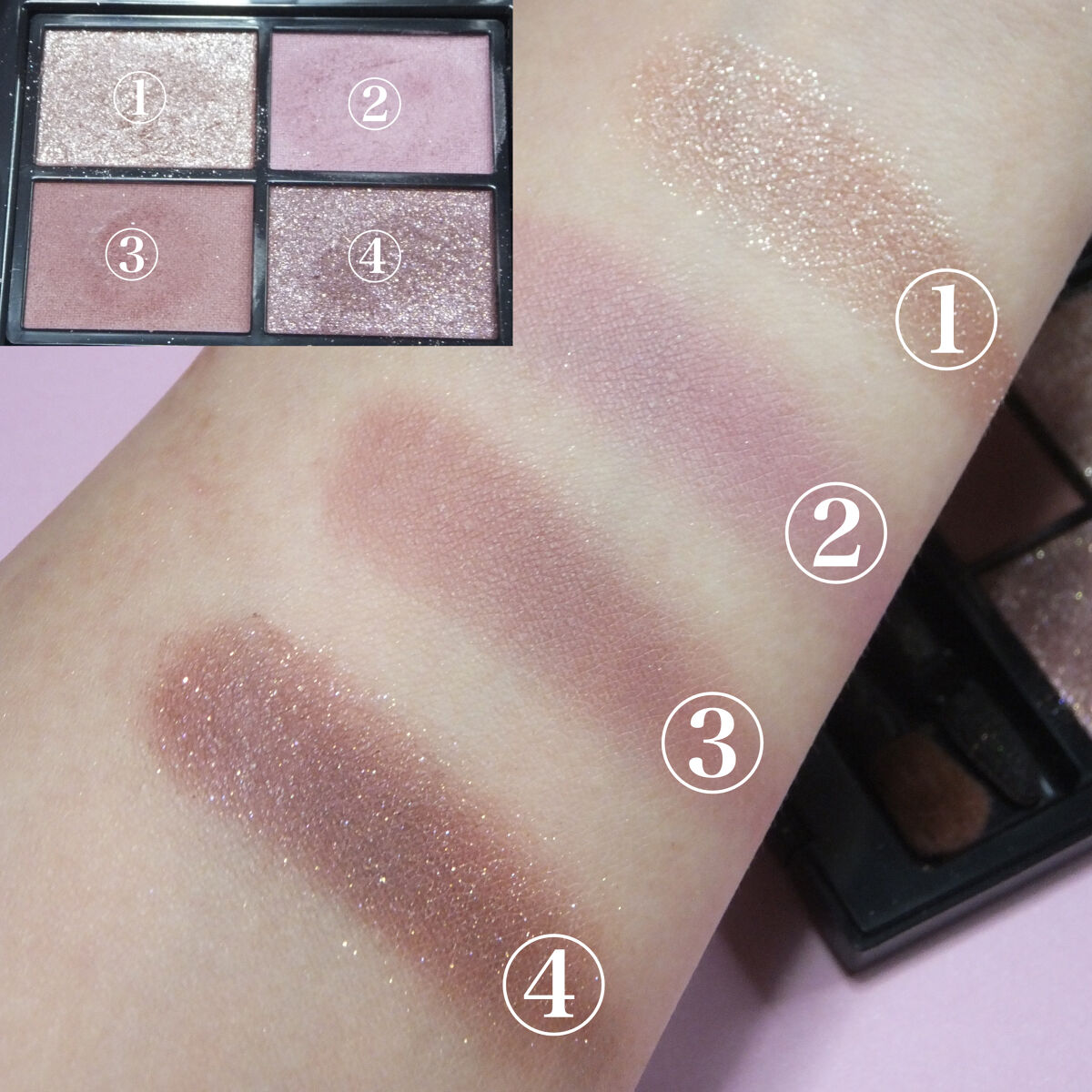 ホリカホリカの多色パレット。 淡いピンクからくすんだピンク、ラメがチラチラ入ったピンクなど沢山のピンクが入っています。 コーラルピンクも私はオレンジが強いと苦手なのですが、そこまで強くなく使いやすいコーラルピンクになっています。 粉質も軽く、淡く柔らかく発色してくれます。 どの組み合わせをしても可愛いパレットです。