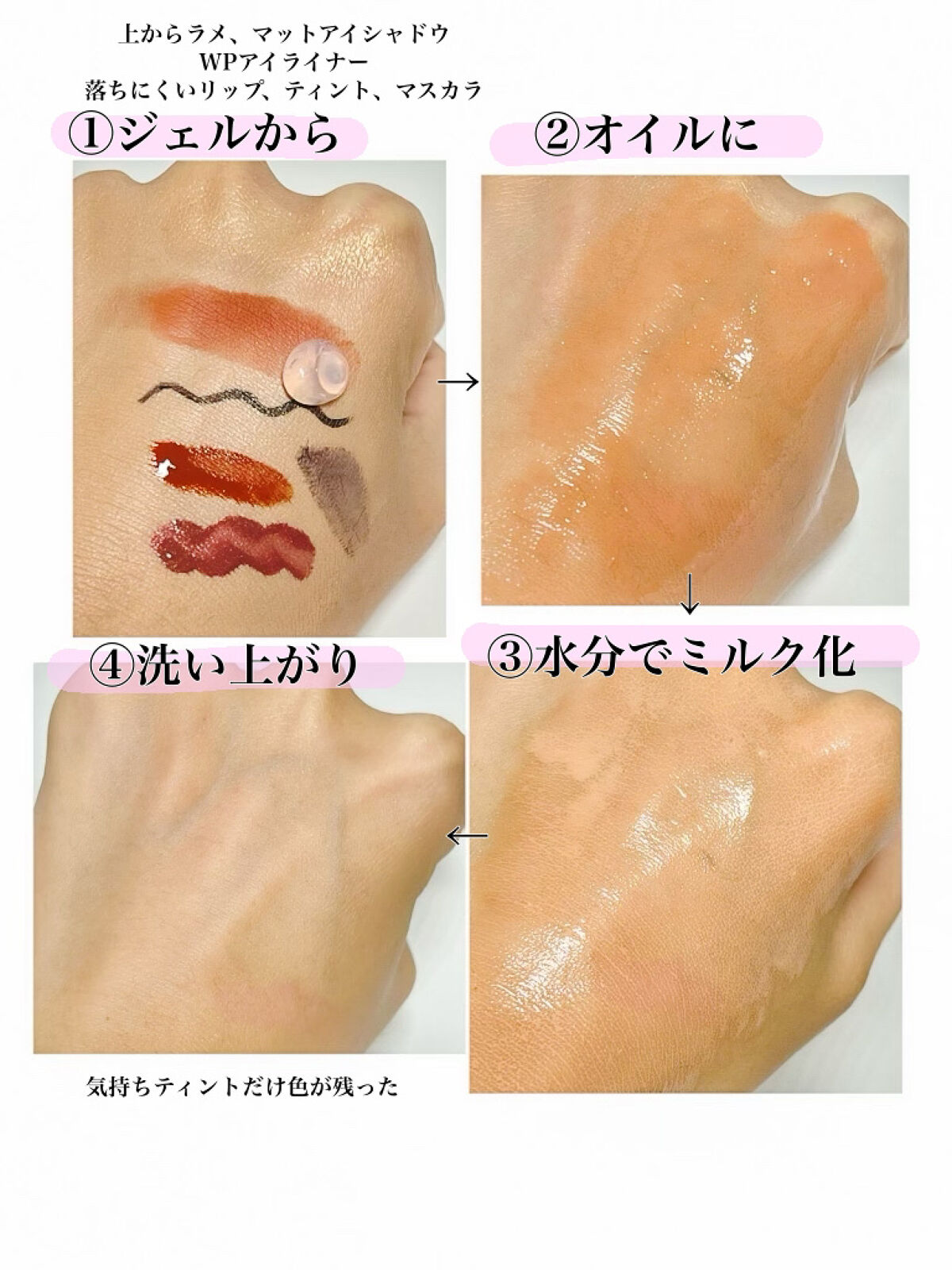 - 【使用方法】 手と肌が乾いた状態でお使いください。 ジェルを適量出し、肌の上でやさしく転がすようにメイク汚れとなじませ、オイル状に変わったら水またはぬるま湯で洗い流してください。 【使用上の注意 / 保存方法】 ◇肌に異常が生じていないかよく注意して使用してください。 ◇肌に傷・はれもの・湿疹など異常のある時は使用しないでください。 ◇使用中(または使用した肌に直射日光があたり)、赤み・はれ・かゆみ・刺激・色抜け(白斑など)や黒ずみなどの異常があらわれた場合は使用を中止してください。そのまま使用を続けると、症状を悪化させることがあるので、皮膚科専門医などにご相談されることをおすすめします。 ◇目に入らないようにご注意ください。目に入った場合は、すぐに水かぬるま湯で洗い流してください。異常が残る場合は、眼科医にご相談ください。 ◇開封後は、なるべく早く使い切るようにしてください。 ◇乳幼児の手の届かないところに保管してください。 ◇直射日光のあたる場所、極端に低温又は高温、多湿の場所を避けて保管してください。 ◇植物由来成分を配合しておりますので、色や臭いに若干差が生じる場合などがありますが品質には問題ありません。 ◇落ちにくいポイントメイクには専用リムーバーのご使用をおすすめします。 ◇使用後は必ずキャップをしっかりと閉めてください。