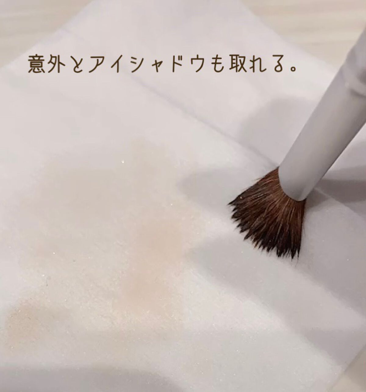 シート自体は手拭き用くらい大判&厚みもしっかり∑(๑ºдº๑)!! 実際使ってみると思ってたよりしっかり落ちる😶🌫️! そしてブラシをコシコシしてると少し泡立つような感触が🤔 ブラシクレンジングシートってやつが気になってた!とか 正直洗うの面倒くさいんだよねぇ…って女子にはおすすめ👌 何より手軽で乾きも早いので朝の忙しい時間に 使った後にササッと拭いてブラシ戻したらOKなのは楽𖤐 ´-