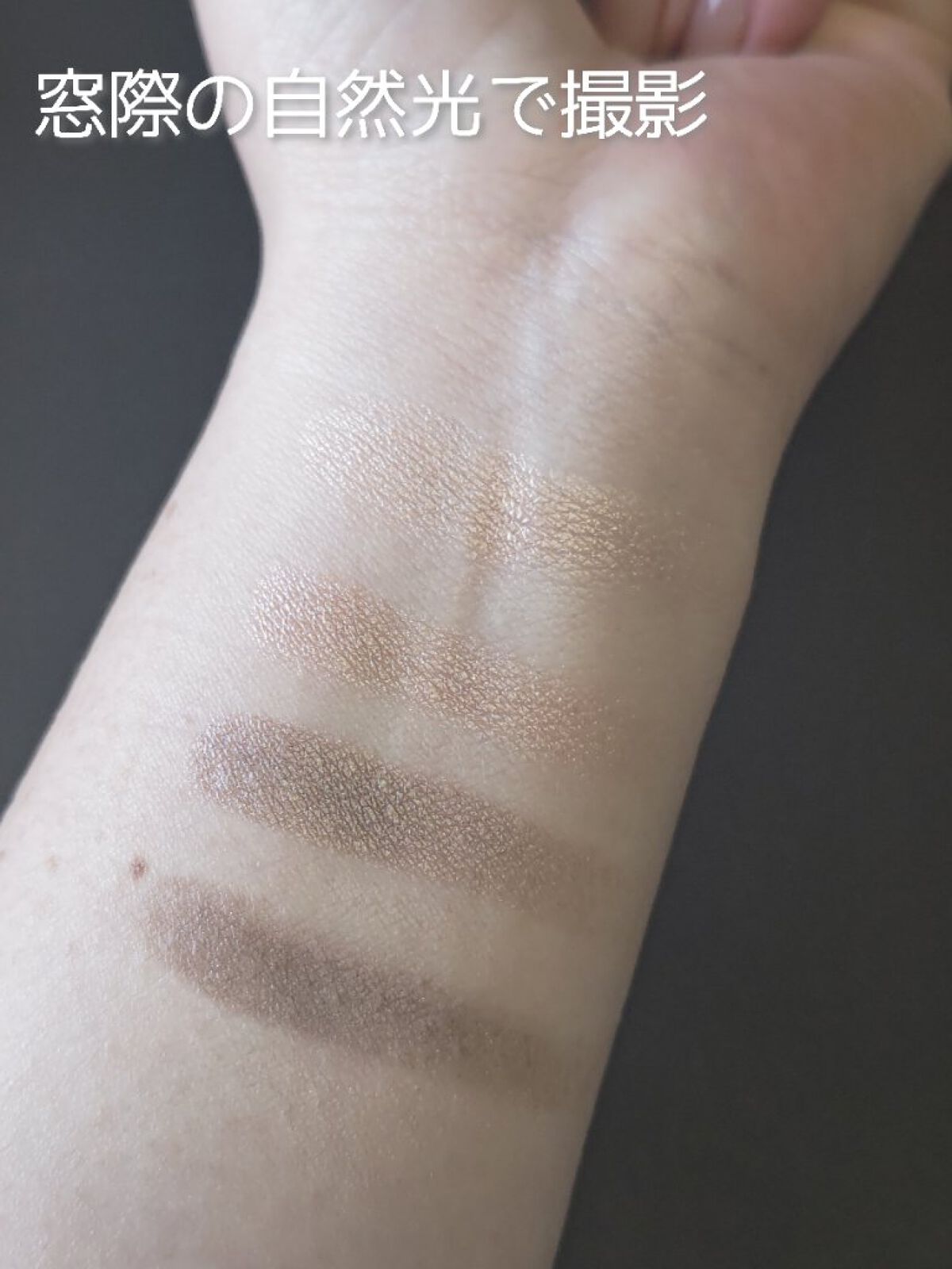 全体をパッと見るとグレージュ系のパレット よくよく見ると肌になじむピンクやモーヴもほんのり感じられる 右2色のラメは淡く儚げな輝き 上段は淡く、柔らかな色出し 右上のピンクラメでさりげない濡れツヤ感が出せる 左上はパール感あり 下段はココア系 ツールで発色をコントロールできるので ナチュラル仕上げにも、しっかりメイクしたい時にも使える ブラシでさらさら塗る➡️肌の自然な影のようになじむ アイシャドウベース+指塗り➡️強く発色する