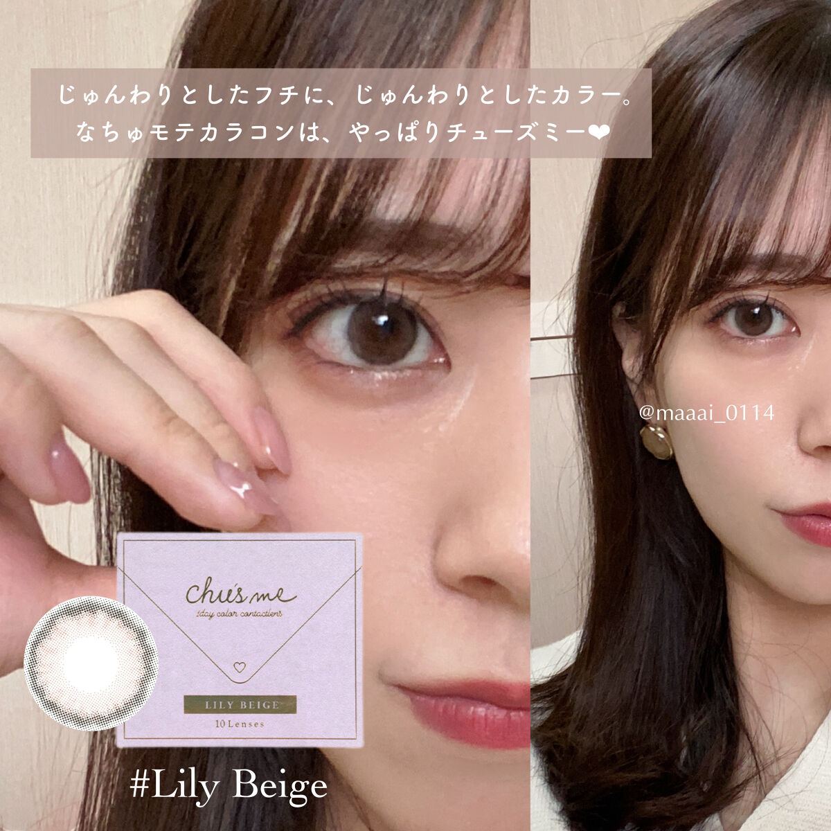 冬の新色**Chu’sme「NOELHUG(ノエルハグ)」**を着けてみたよ🤍やわらかいグレーで、雰囲気をふんわり見せたい日に使いやすいカラー。メイクの系統も問わず、デイリーにも合わせやすかった◎・DIA14.2mm・着色直径13.8mm・B...