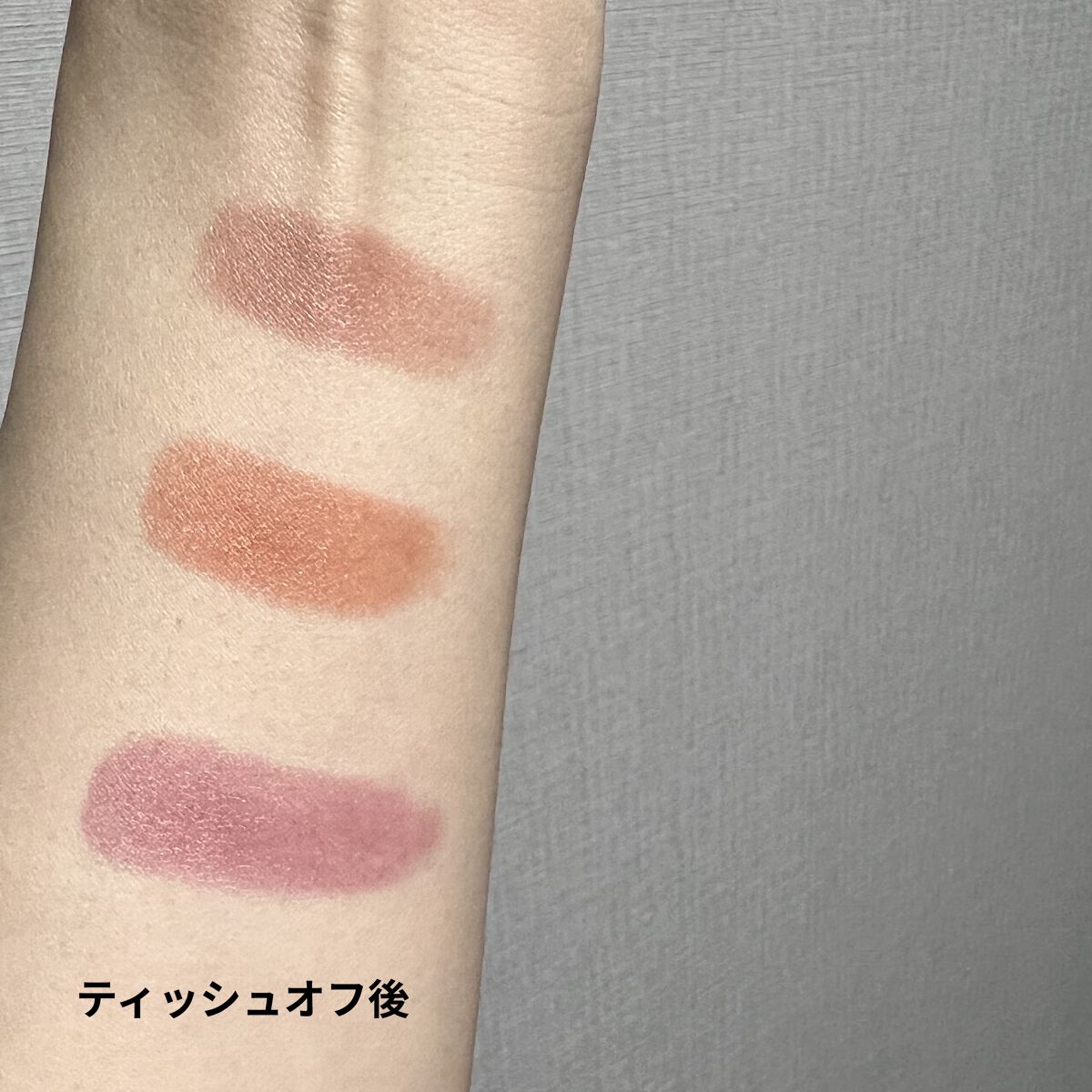 トロッと柔らかいテクスチャー 塗ってすぐ膜が張ったような感じ 触っても落ちにくい コップにも付きにくい 発色が綺麗 濃すぎず薄すぎずちょうど良い色 ティッシュで拭いても色が残ってる 唇の荒れてる部分や乾燥、皺が目立ちやすい ブルベ、イエベ、ニュートラルそれぞれへのオススメの色が示されていてとても選びやすい