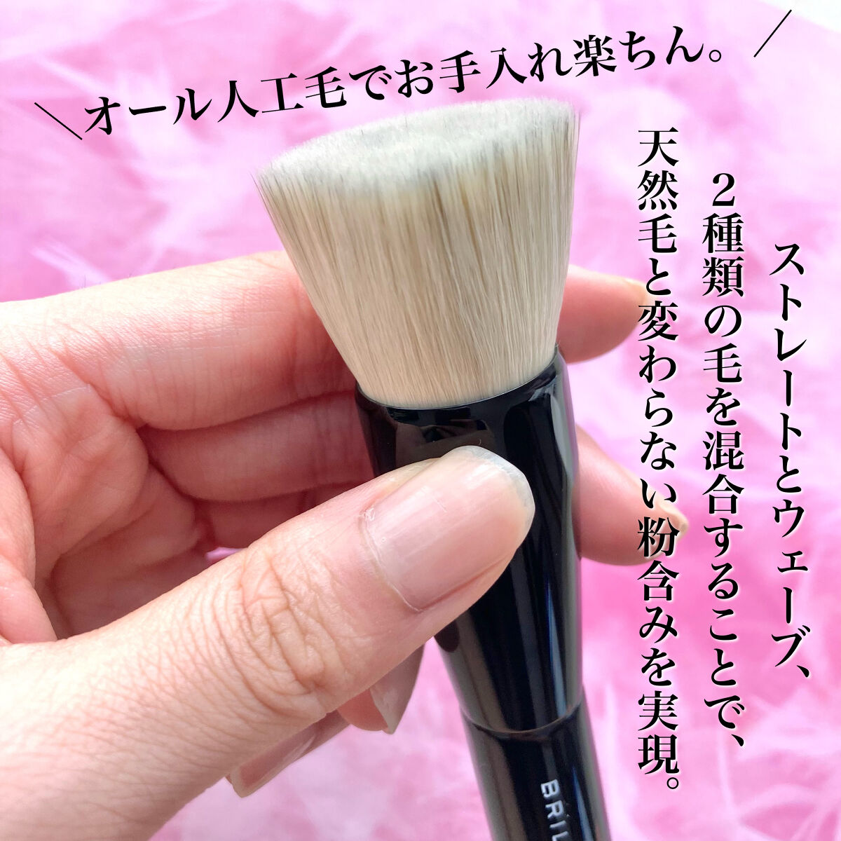 - パウダリー、リキッド、クリーム、クッションどんなタイプのファンデーションにも対応。 毛量はもちろん、長さもミリ単位で追求したブラシはオール人工毛でありながら、まるで山羊毛のように柔らか。 ストレートとウェーブ、2種類の毛を混合することで、天然毛と変わらない粉含みを実現しました。 しっかりとしたコシを兼ね備えているので、肌の上をサッとすべらすだけで、誰でも失敗することなくなめらかな美肌に。 また、リキッドファンデーションに使用すれば、肌にムラなく高密着し、簡単にツヤ肌が完成します。
