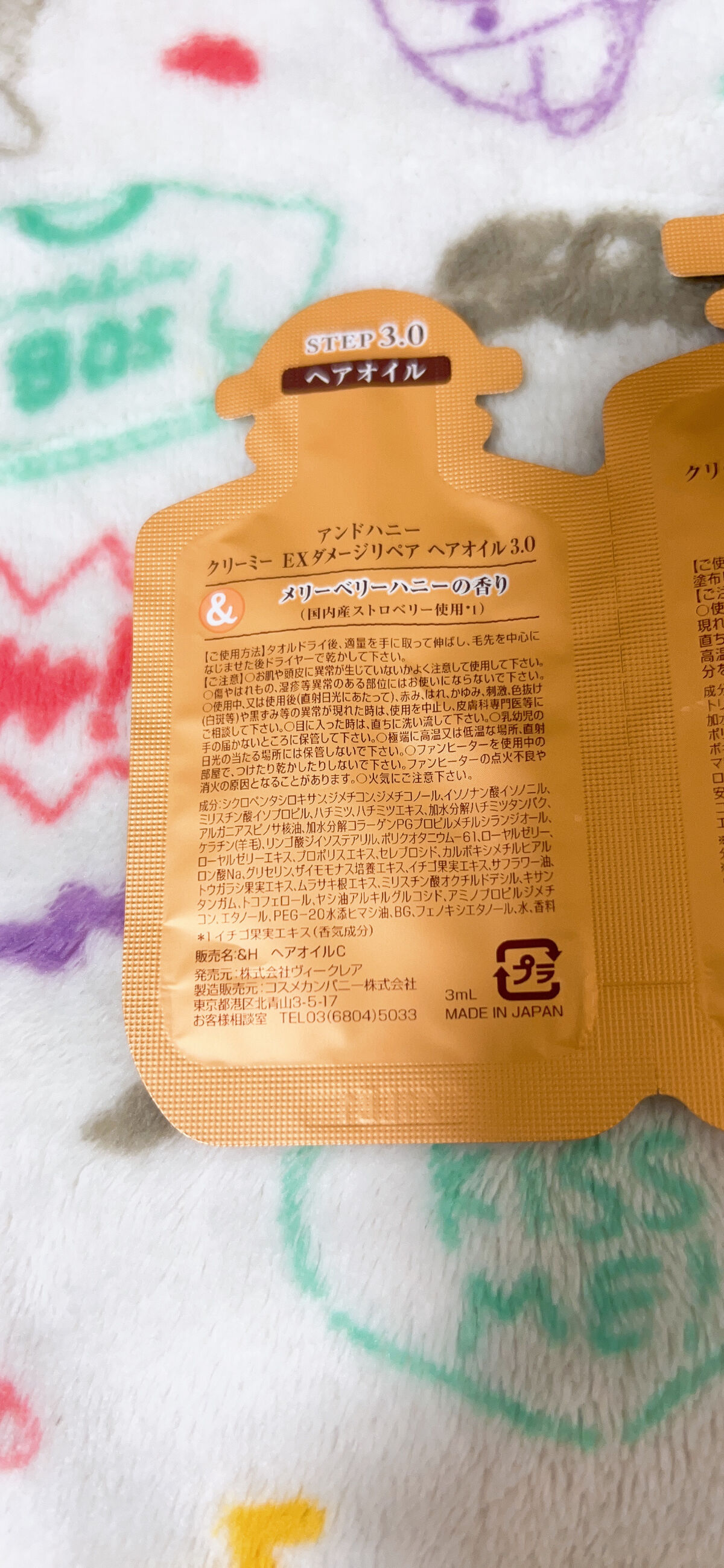 - <&honey Creamy EXダメージリペアヘアオイル3.0> シクロペンタシロキサン、ジメチコン、ジメチコノール、イソノナン酸イソノニル、ミリスチン酸イソプロピル、ハチミツ、ハチミツエキス、加水分解ハチミツタンパク、アルガニアスピノサ核油、加水分解コラーゲンPGプロピルメチルシランジオール、ケラチン(羊毛)、リンゴ酸ジイソステアリル、ポリクオタニウム-61、ローヤルゼリー、ローヤルゼリーエキス、プロポリスエキス、セレブロシド、カルボキシメチルヒアルロン酸Na、グリセリン、ザイモモナス培養エキス、イチゴ果実エキス、サフラワー油、トウガラシ果実エキス、ムラサキ根エキス、ミリスチン酸オクチルドデシル、キサンタンガム、トコフェロール、ヤシ油アルキルグルコシド、アミノプロピルジメチコン、エタノール、PEG-20水添ヒマシ油、BG、フェノキシエタノール、水、香料